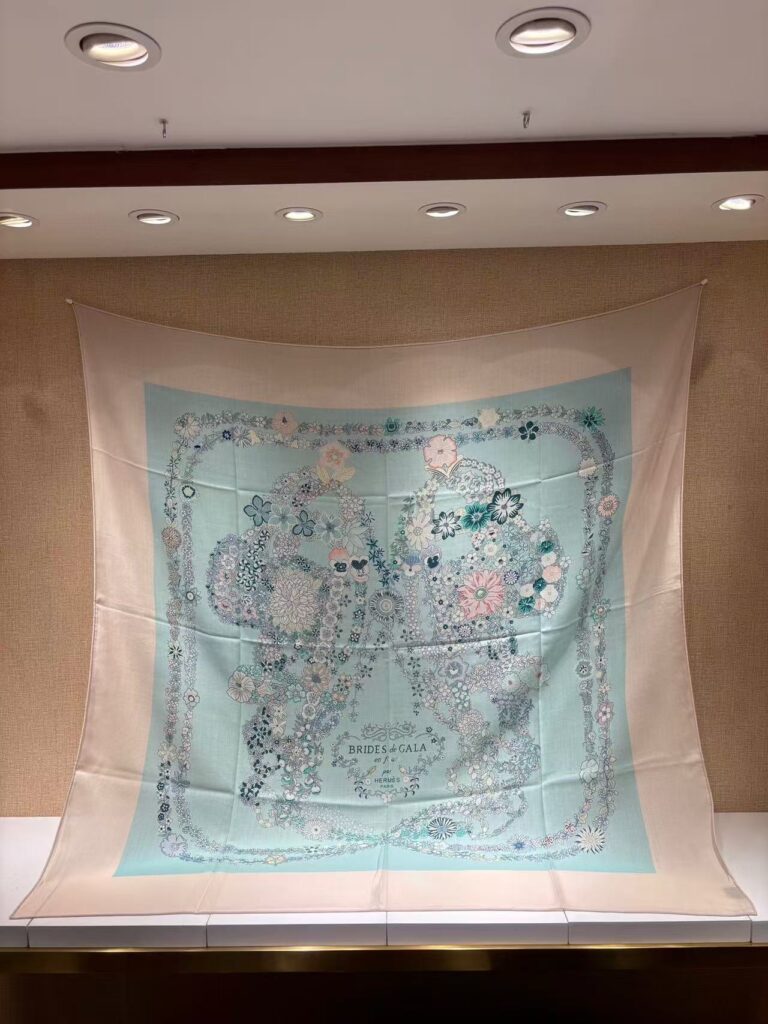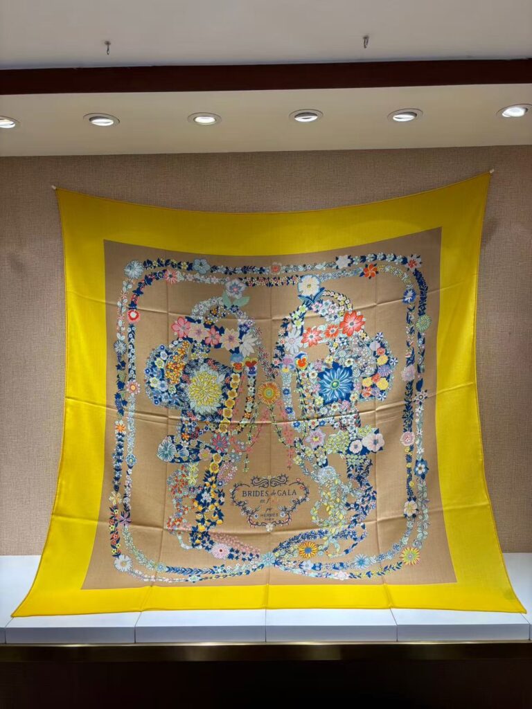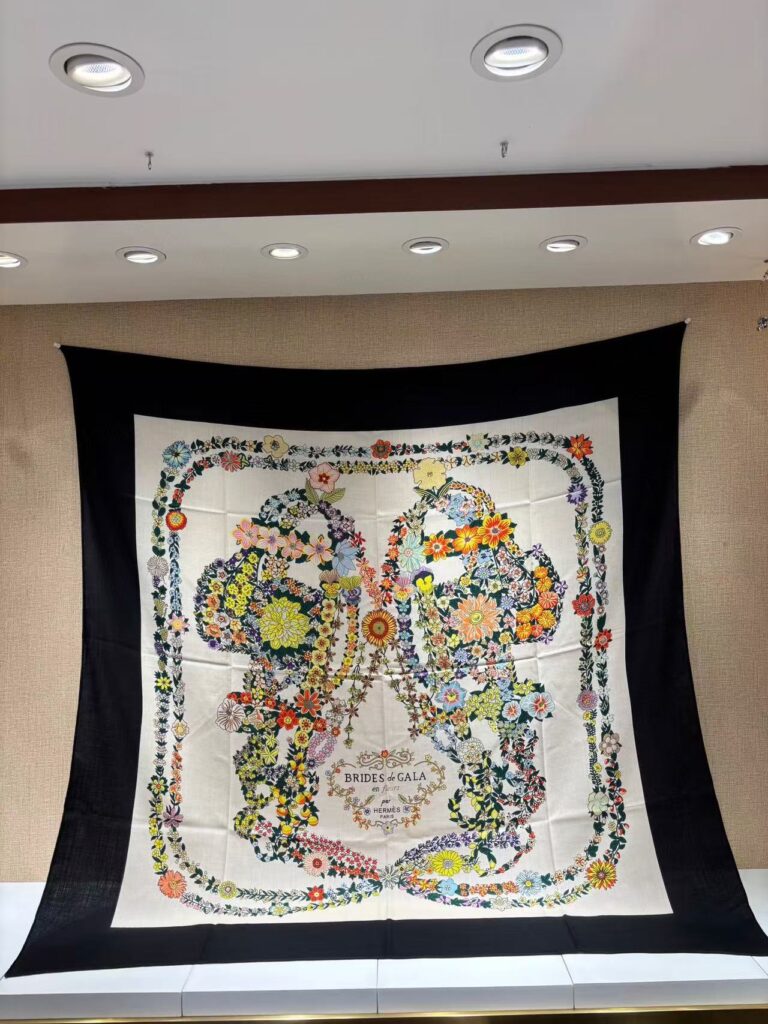 HERMES Floral geometric pattern printed mulberry silk scarf for women 140x140cm
