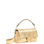 The iconic mid-sized Baguette bag was first introduced in 1997 and has since become the premier It bag. Functional and timeless. it is inspired by the classic armpit design of French baguette bread. which is also the source of the bag's name.Crafted from soft golden nappa leather. it is embossed with the classic FF motif in 3D effect and features an FF closure.Featuring a front flap with magnetic closure. fabric-lined interior compartments. zipped pockets and gold-plated metalwork.With detachable handles and shoulder strap. the bag can be carried by hand. over the shoulder or diagonally. (FF Pattern Bag In Gold Nappa Leather)