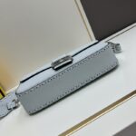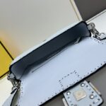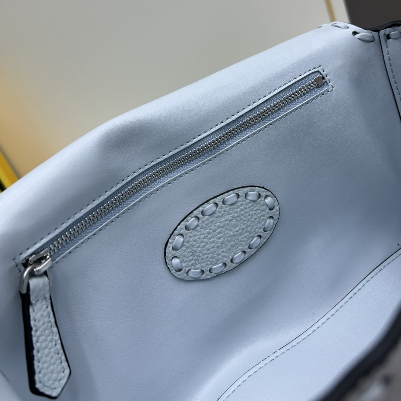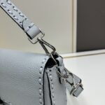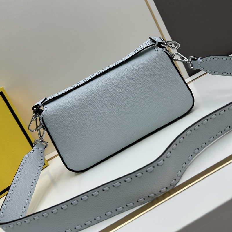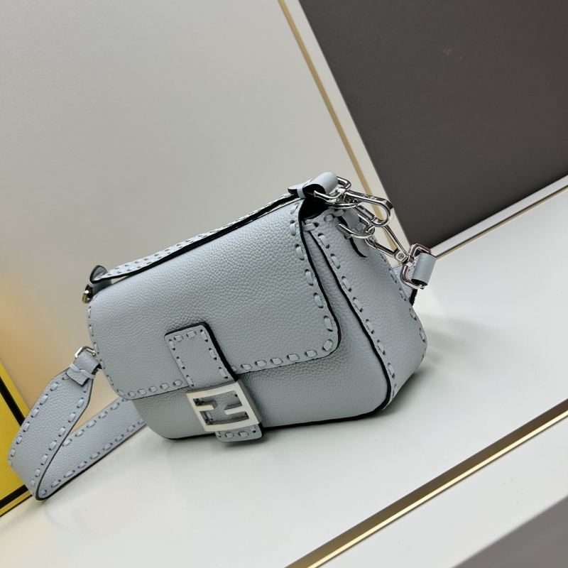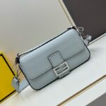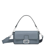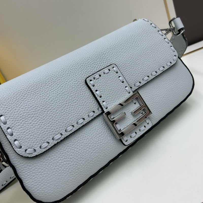The iconic Baguette medium handbag. made with 612 stitches of large bright thread in the same colour. represents the classic craftsmanship of Selleria. which originated in 1925 and has been passed down from generation to generation by Fendi artisans.Cuoio Romano leather in sky blue. with signature natural graining. is tanned without the use of any metal.Featuring a front flap with magnetic closure. calf leather-lined interior compartment and internal zipped pocket with silver-tone Selleria plaque and silver-tone finish metal parts.Embellished with FF clasp.Handbag with carry handles and detachable shoulder strap. can be carried by hand or over the shoulder.(Selleria Bag In Sky Blue)
