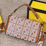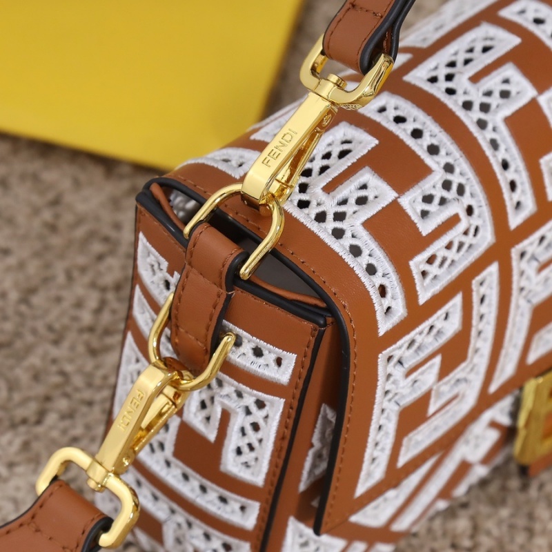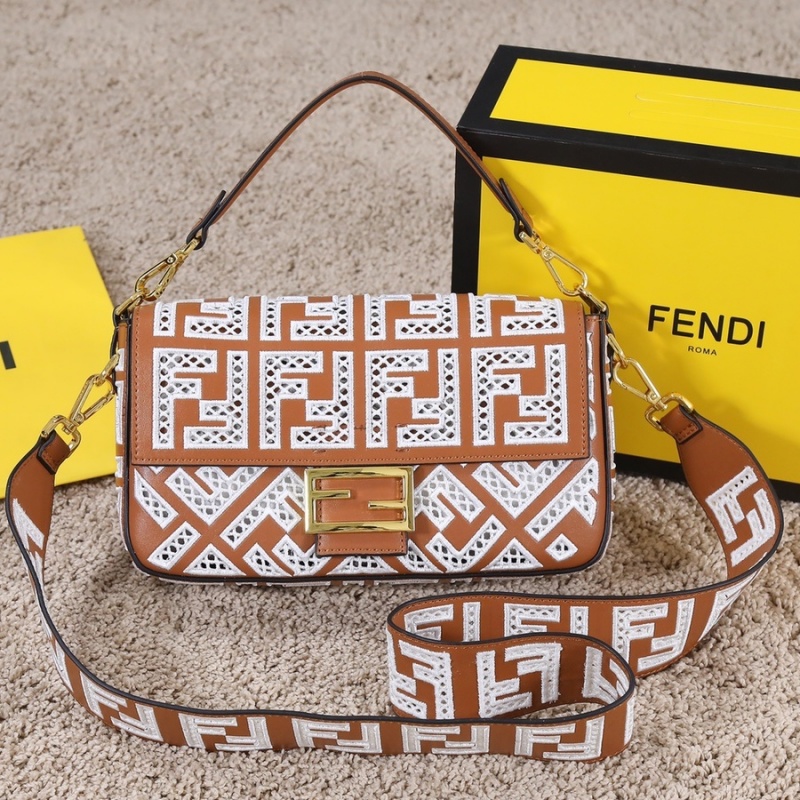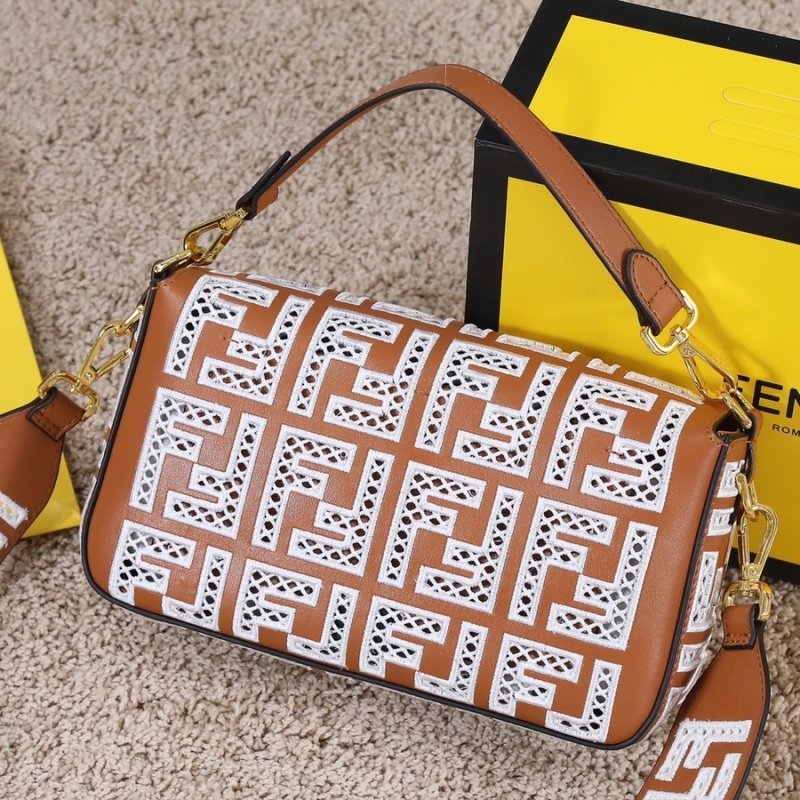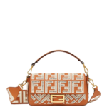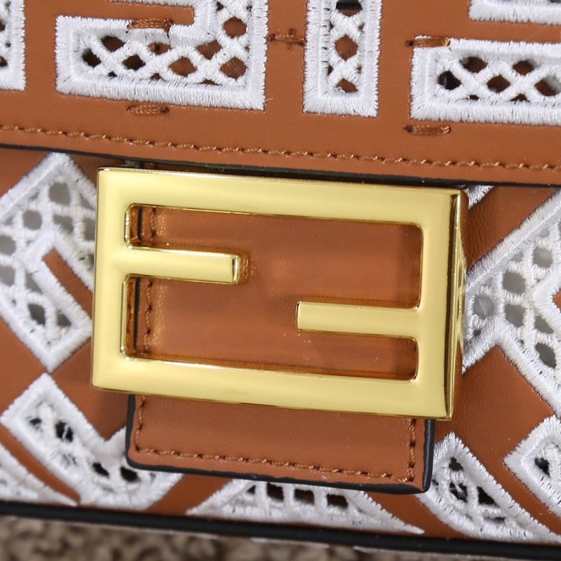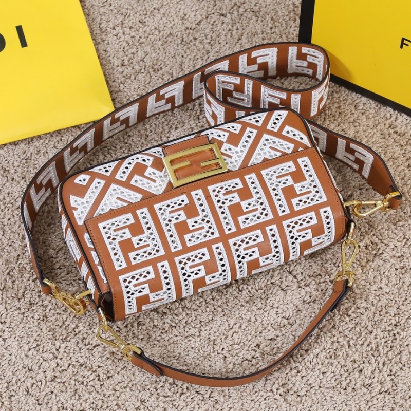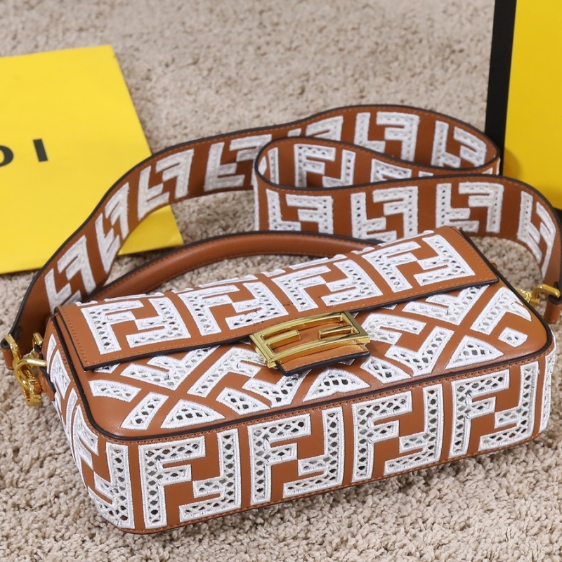 The Baguette's FF motifs are cut out and embroidered on the body to simulate the transparency of an openwork window. and the brown version is crafted in calf leather. Handbag with detachable handles and shoulder strap. can be carried by hand. over the shoulder or crossbody.