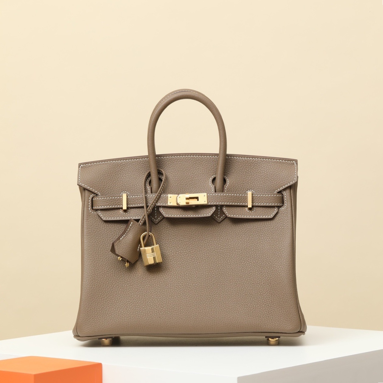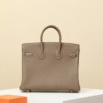This Birkin 25 bag is made of Togo leather with metal accessories and comes with tonal stitching. front flap. two straps with center buckle. clochette with lock and two keys. and double rolled handles.