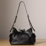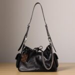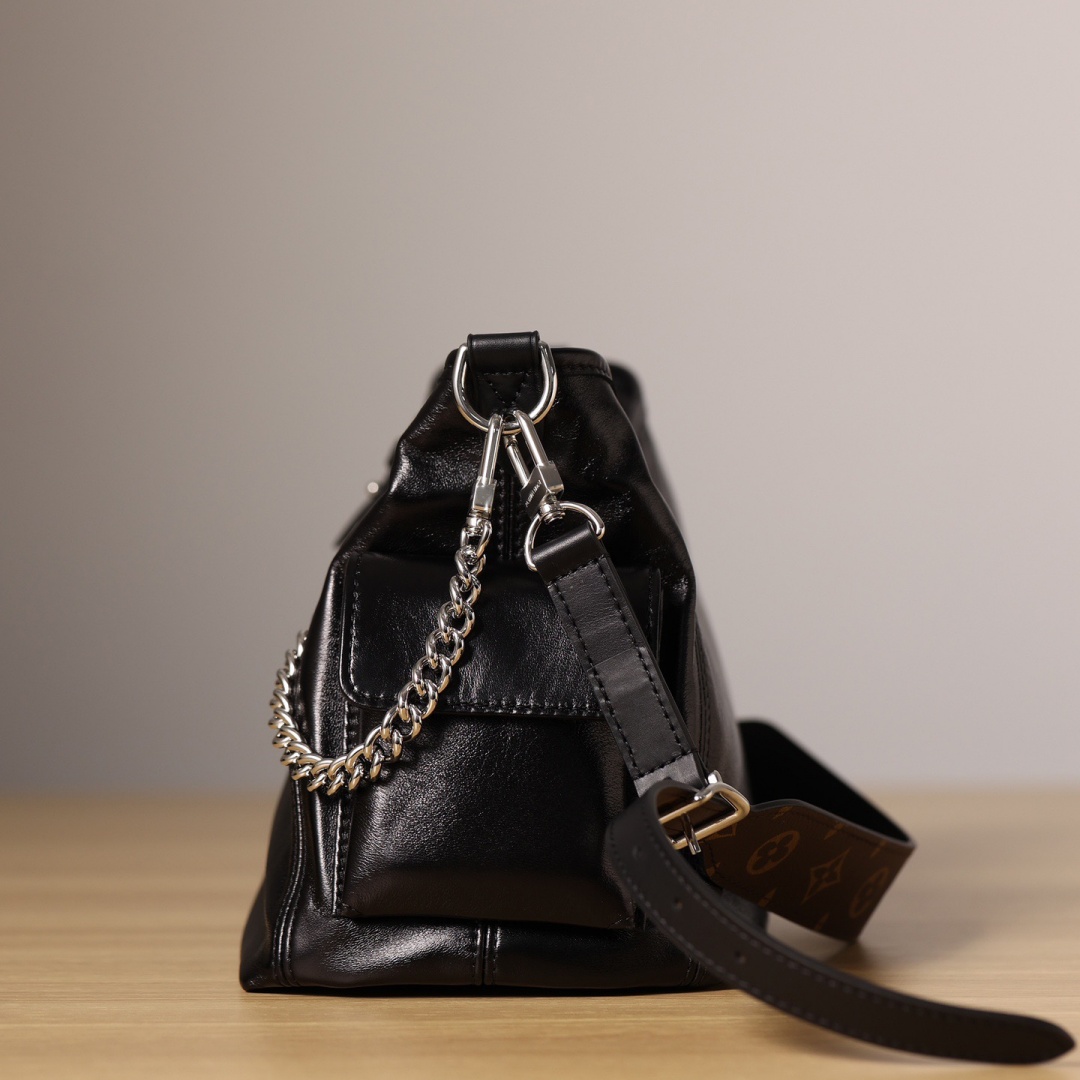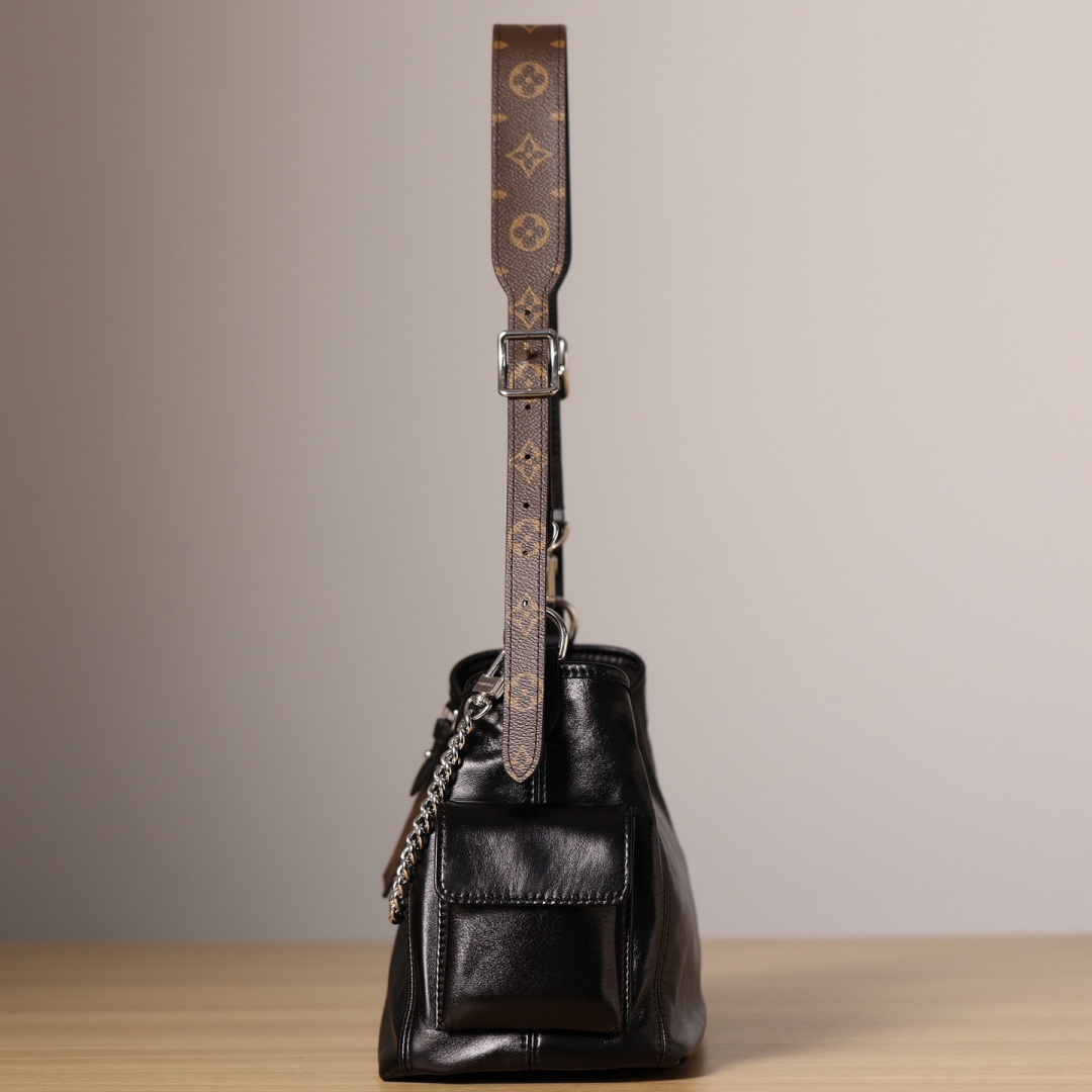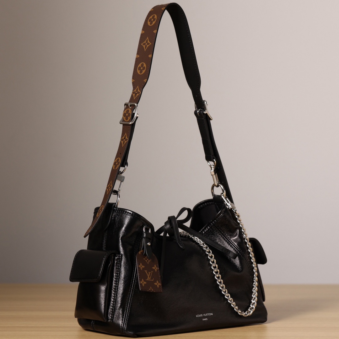 With its dark allure and slouchy silhouette. the CarryAll Cargo Vibe PM handbag is crafted from ultra-soft lambskin with a cool. slightly rumpled aspect and is accented with polished palladium-finish hardware. This day-to-evening piece offers great styling potential. thanks to a removable strap and a chic. detachable chain.