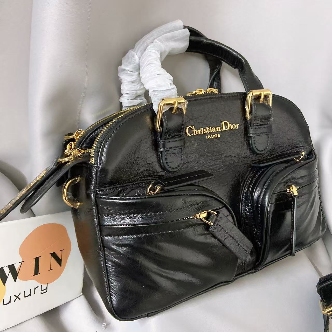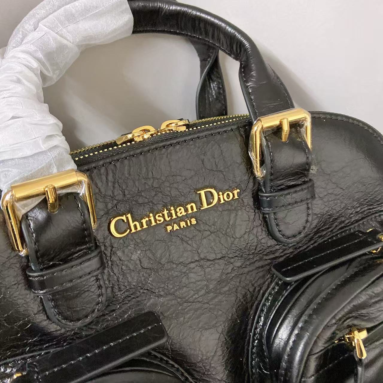 DIOR Grand Tour Fashionable pleated design leather bowling bag shoulder bag crossbody bag handbag black women’s holiday gift