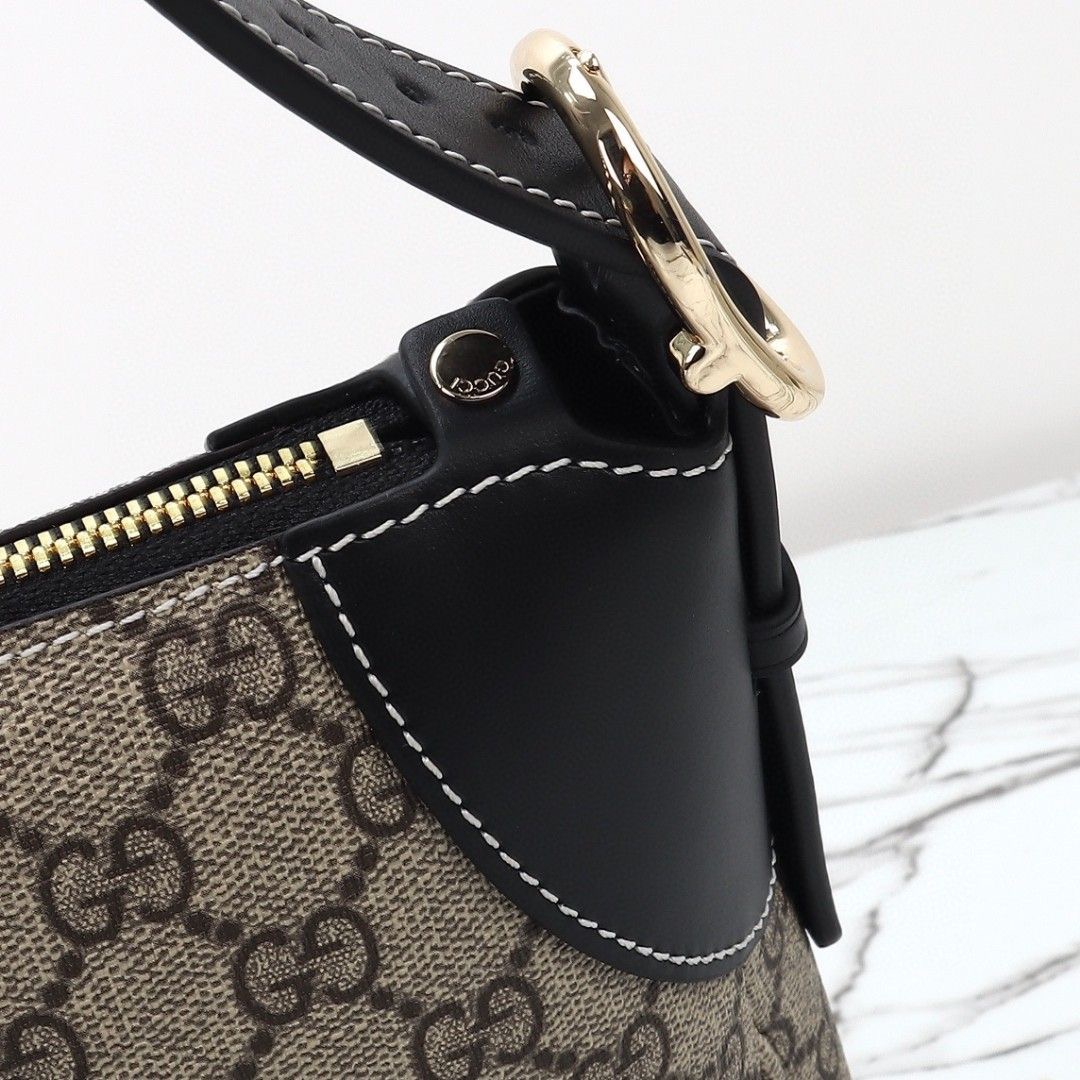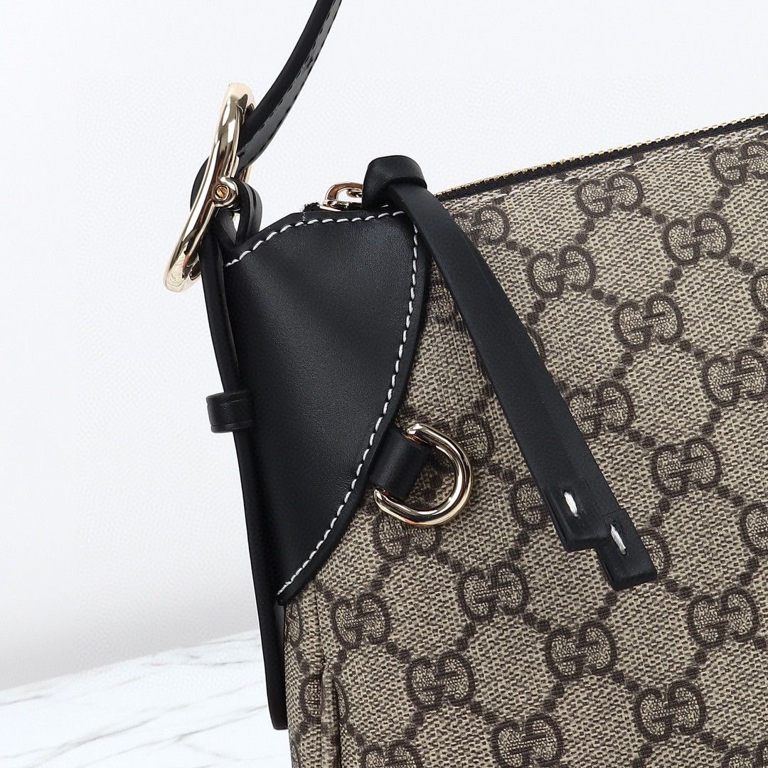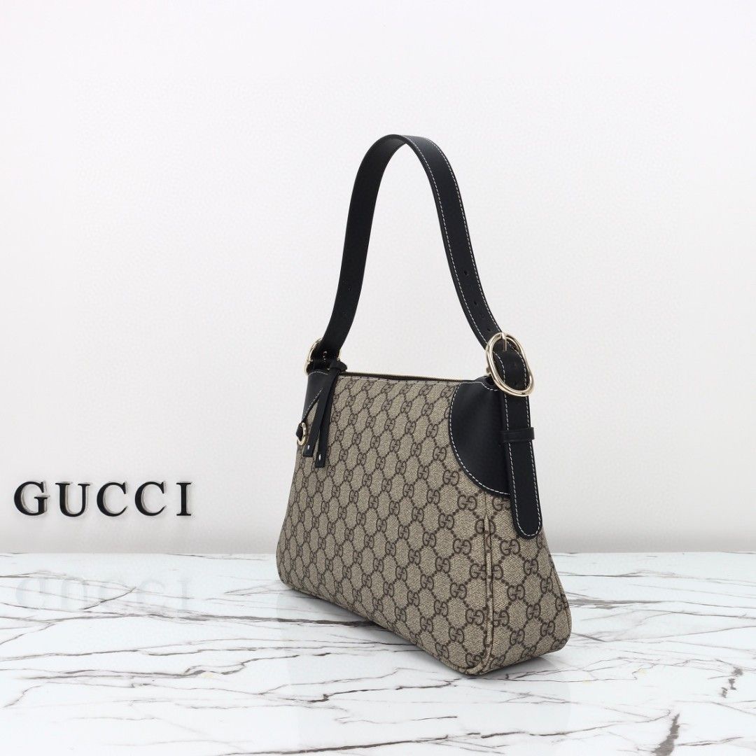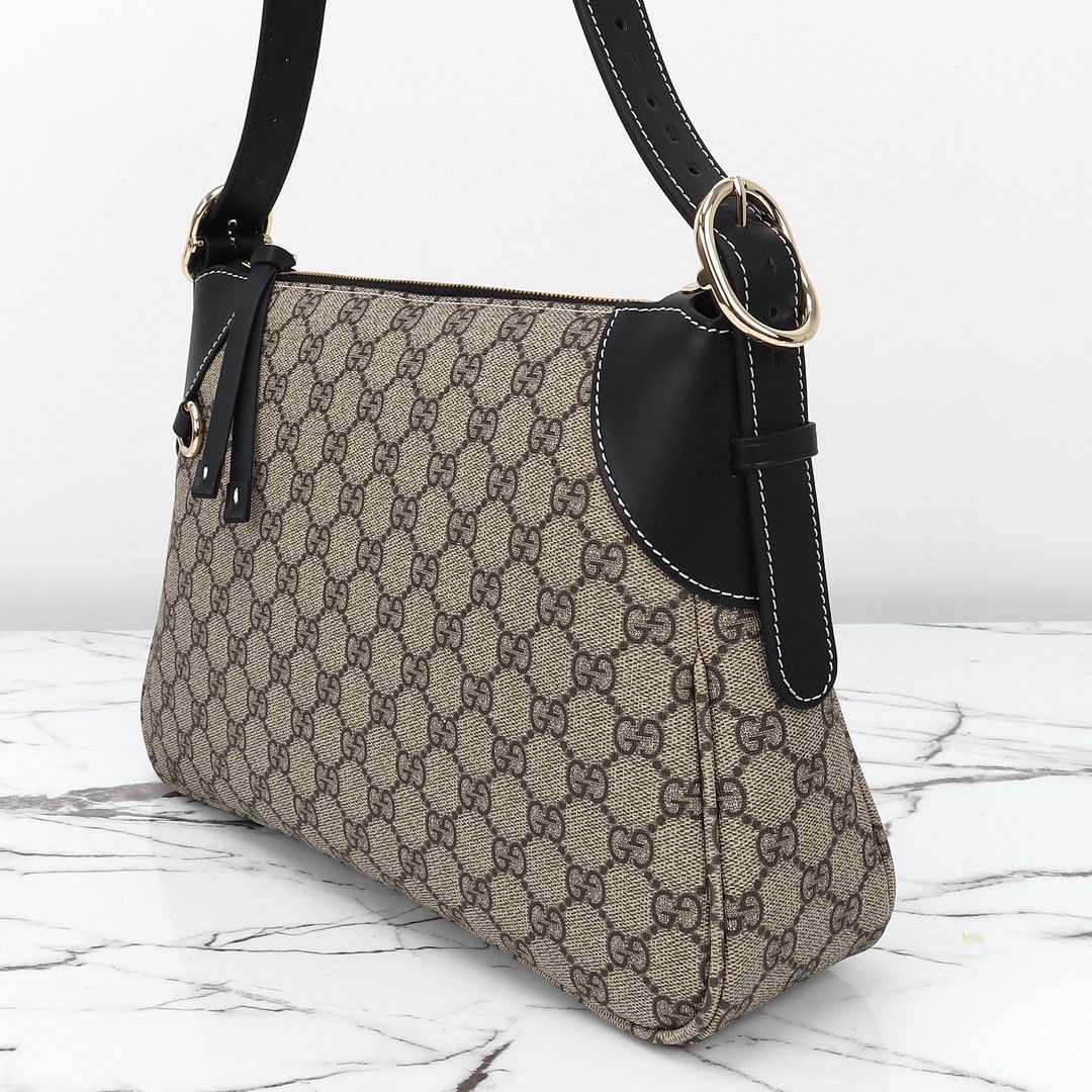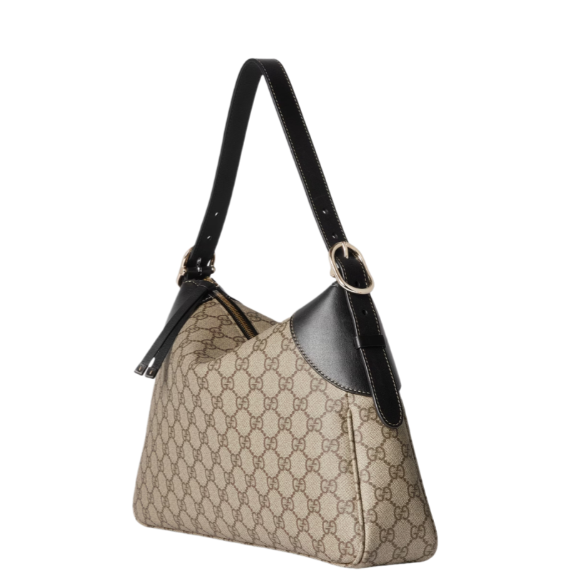 The new GG Emblem collection reinterprets the House's history of elegance and craftsmanship. This large shoulder bag features numbered notches on the adjustable shoulder strap. inspired by the equestrian world.