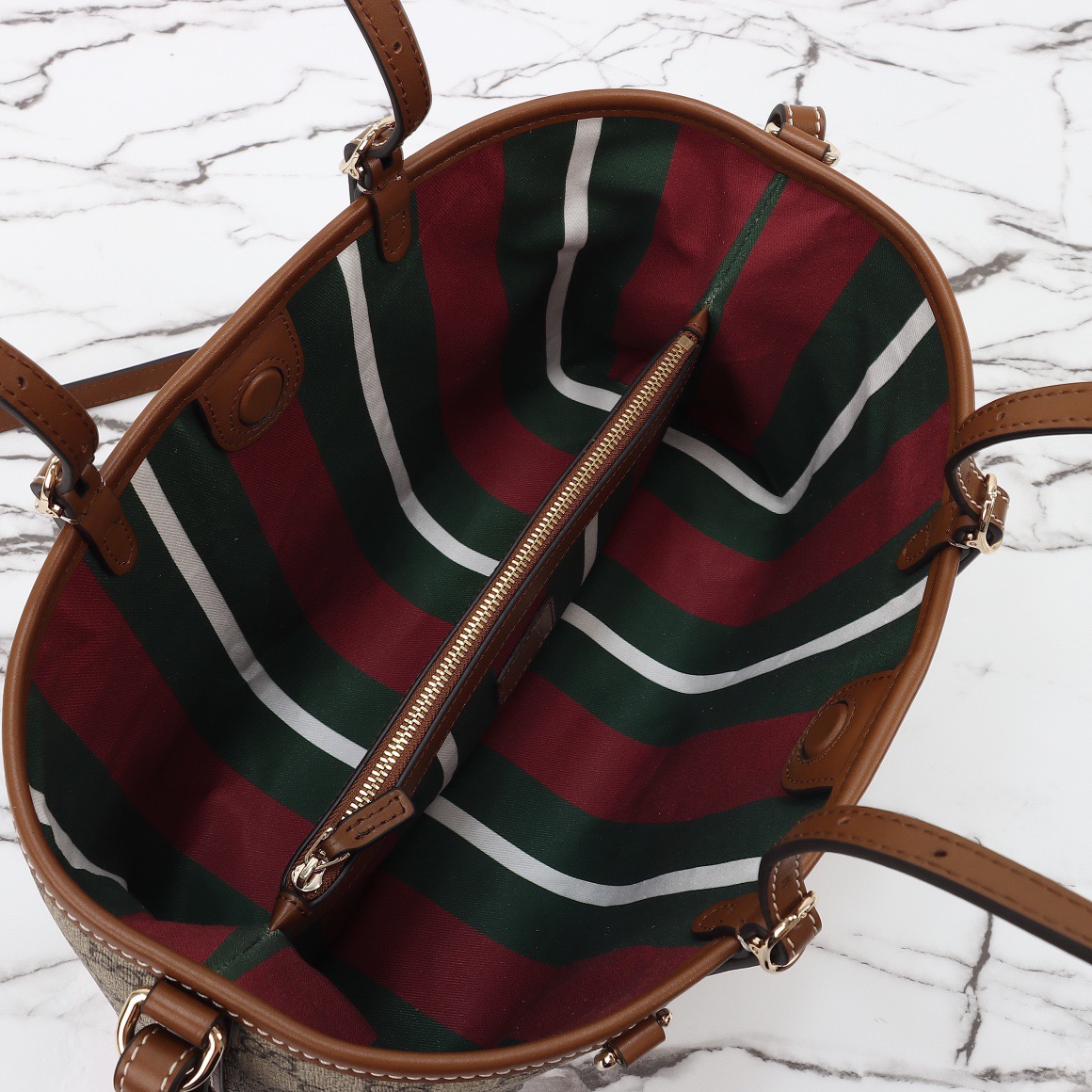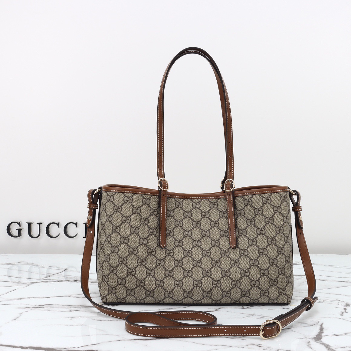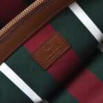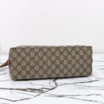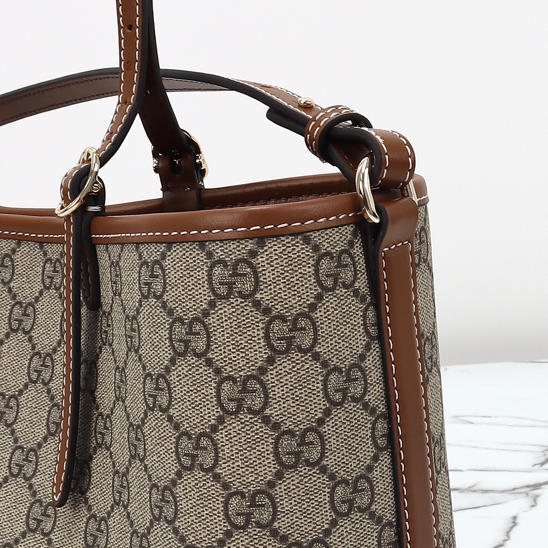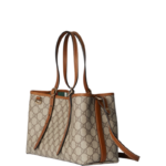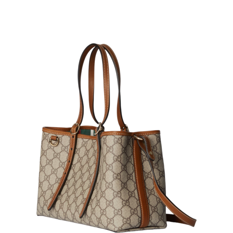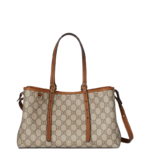 The new GG Emblem collection reinterprets the House's history of elegance and craftsmanship. This small tote bag features numbered notches on the adjustable top handles. inspired by the equestrian world.