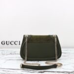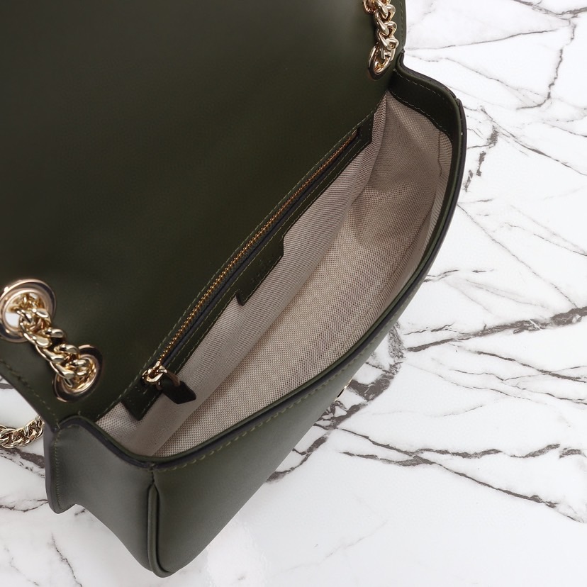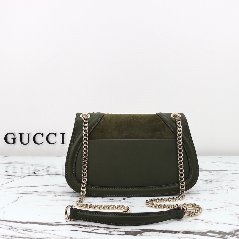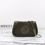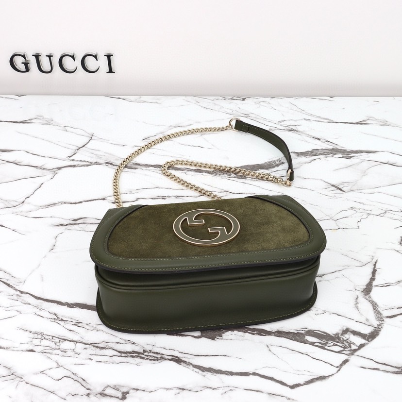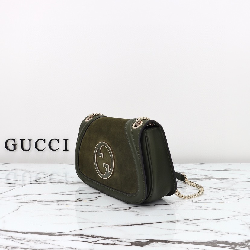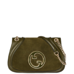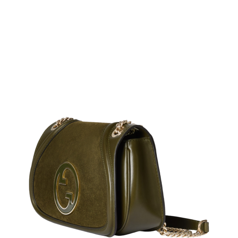 The new Gucci Blondie bag. whose distinctive logo first appeared in the House's collections in the early 1970s. weaves together past and present in a fusion of nostalgia and modernity. This small shoulder bag is crafted from dark green suede. featuring the House's round symbol in enamel. The gold-toned chain and leather strap can be worn on the shoulder or crossbody.