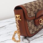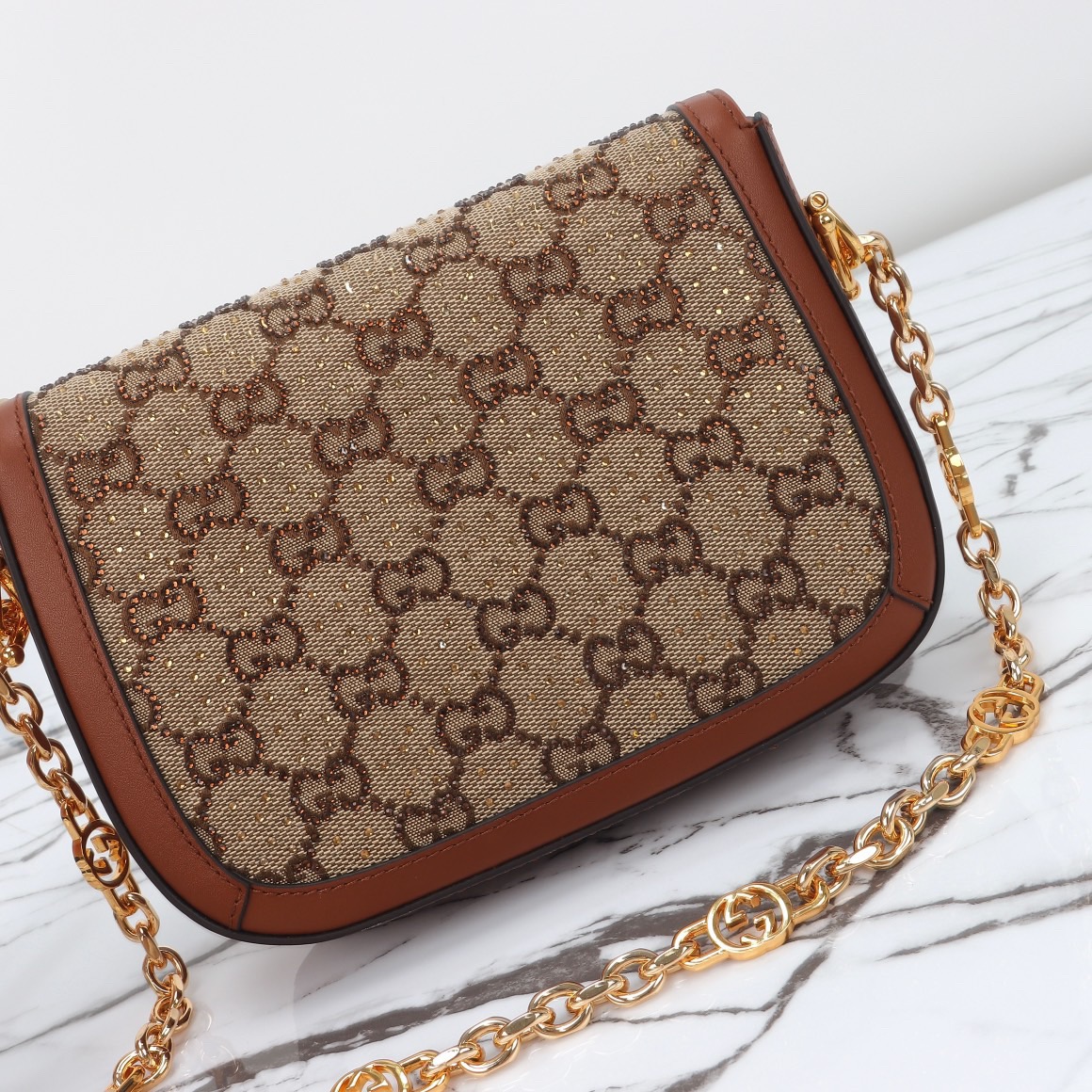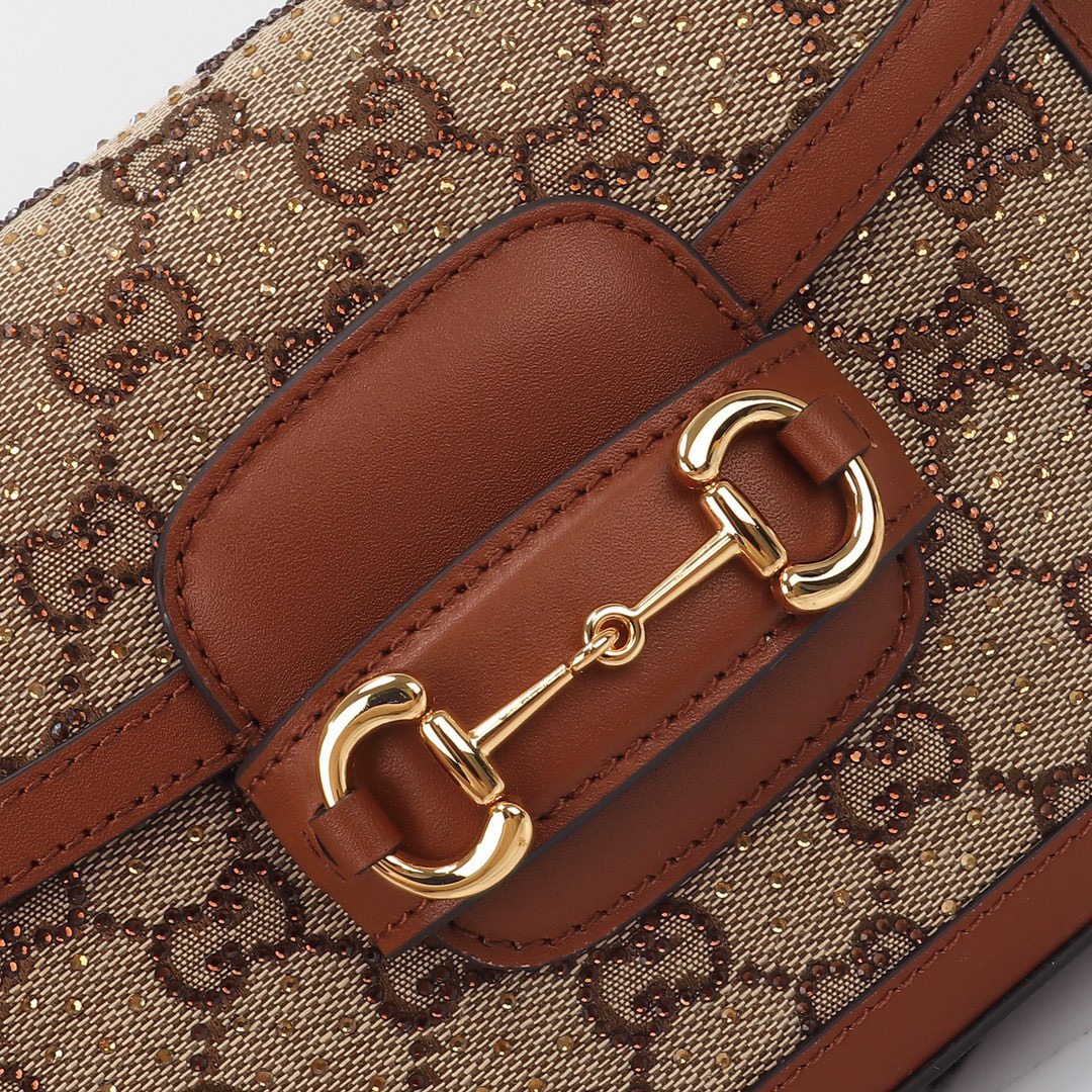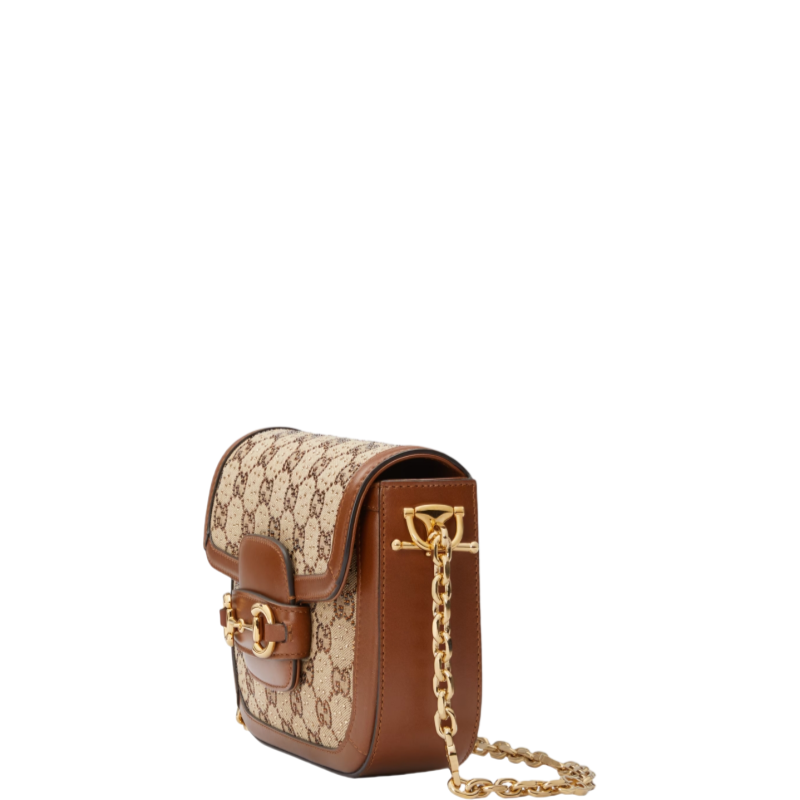 Presented in camel and ebony GG canvas. this bag is further enhanced by crystals. The structured shape and clean lines of the Gucci Horsebit 1955 highlights the collection's signature gold-toned hardware. Part of Gucci's genetic code. the double ring and bar design has been established as one of the most distinctive elements among the House symbols borrowed from the equestrian world. A delicate chain strap with monogram details adds a refined note to the style.