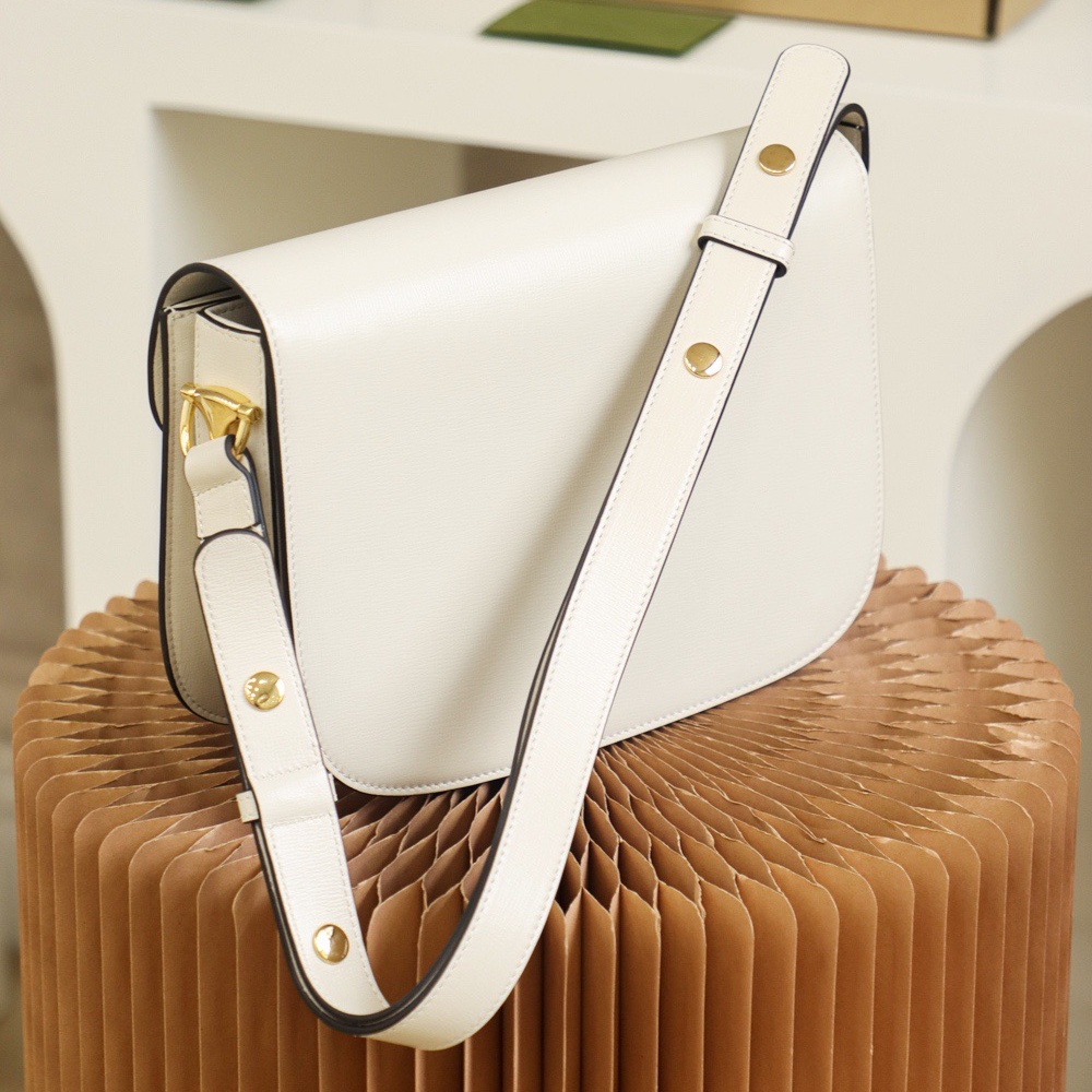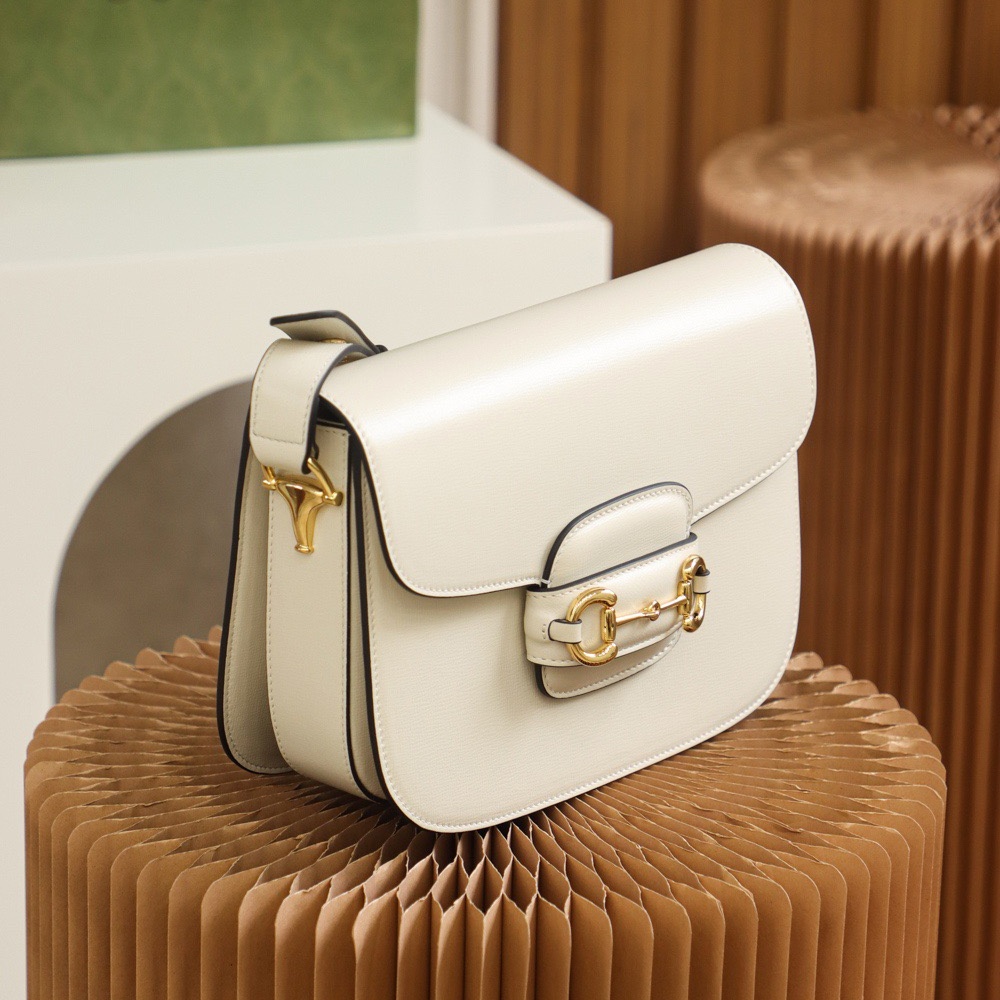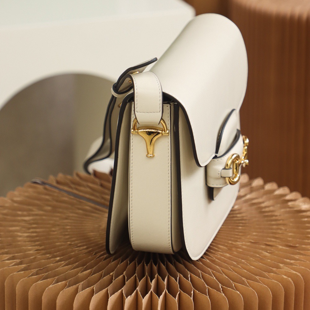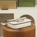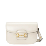 Launching for the 2020 cruise season. the Gucci Horsebit 1955 handbag has been recreated from a historical design. Following the same lines and shapes as when it was first introduced more than sixty years ago. this accessory highlights the horsebit by blending original details with a modern spirit. Part of the Gucci genetic code. the double ring and bar design has become one of the most distinctive elements of the brand's signature borrowed from the equestrian world. This small flap shoulder bag is crafted from white textured leather with hardware and a special mechanism to adjust the length of the shoulder strap. so it can be carried over the shoulder or across the body.