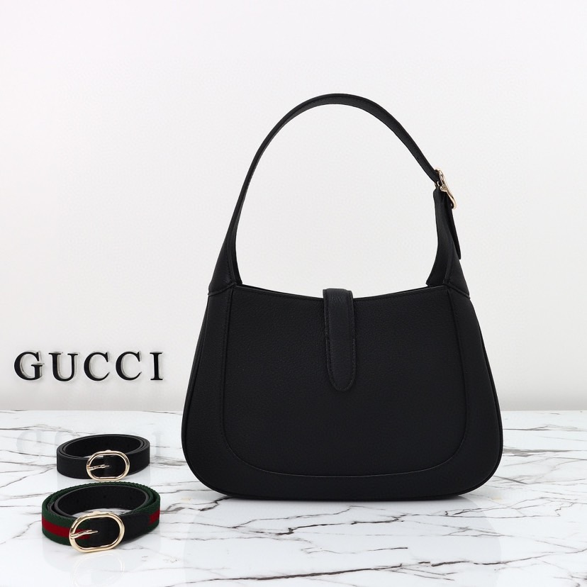 In the Fall Winter 2024 collection. the Gucci Jackie 1961 shoulder bag with new light gold-toned piston closure features fine black leather. highlighting its craftsmanship. crescent shape. and sleek silhouette. This small size comes with a leather strap and additional green and red Web strap for different styling possibilities.