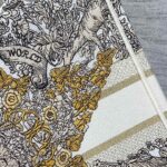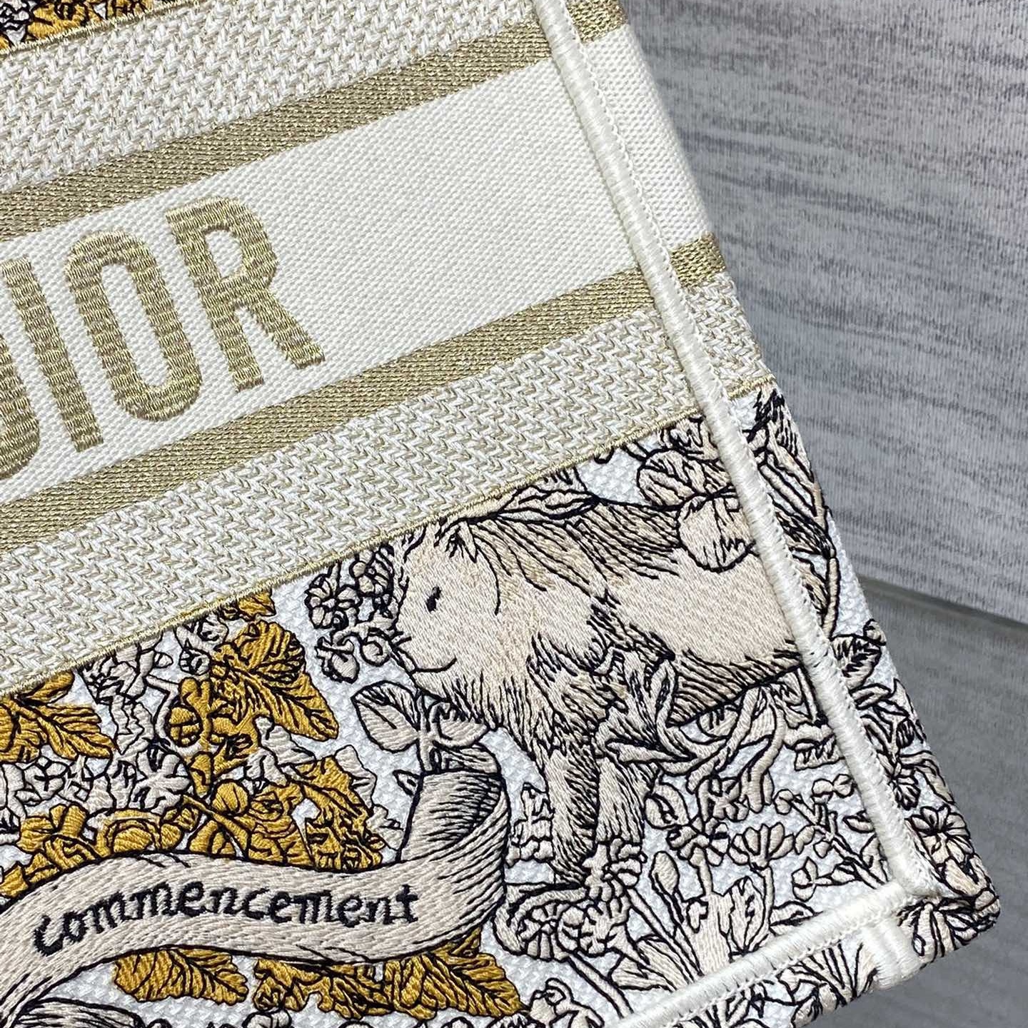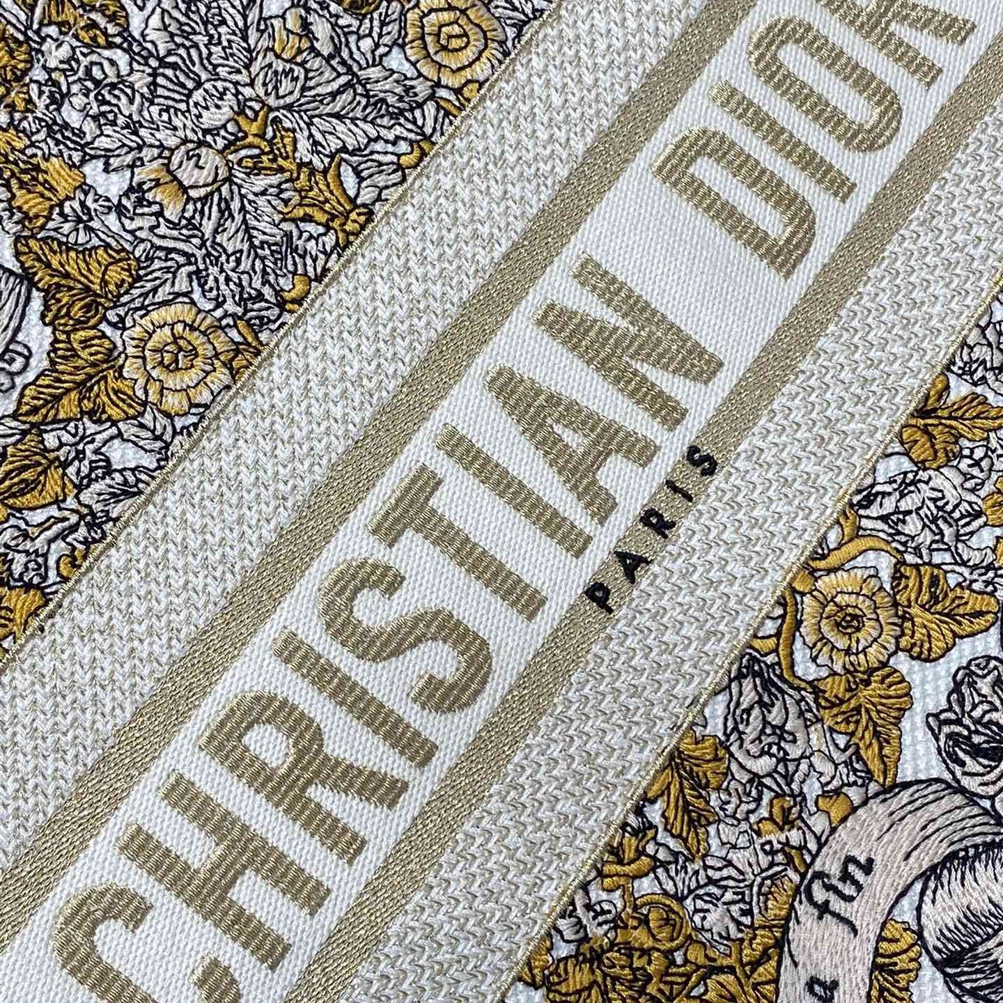 Introduced by Maria Grazia Chiuri. Creative Director of Christian Dior. the Dior Book Tote has become a staple of the Dior aesthetic. Designed to hold all the daily essentials. the latte style is fully embroidered with Pietro Ruffo's gold-tone Dior Around the World motif. showcasing a star decorated with flowers in honor of Scottish heritage. the collection's hallmark theme. and an allegory of the senses with a Marie Stuart quote: En ma fin est mon commencement (In my end is my beginning). Adorned with the Christian Dior Paris signature on the front. the medium tote is a prime example of Dior's savoir-faire and can be carried by hand or worn over the shoulder. The bag can be coordinated with the season's other Dior Around the World creations.