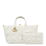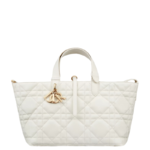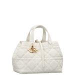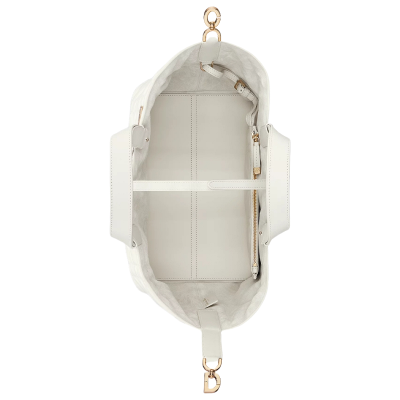 The Dior Toujours bag is distinguished by a casual and practical design. Crafted in latte calfskin with Macrocannage topstitching. it showcases a spacious interior compartment with a matching pouch to organize essentials. Its thin leather strap closure keeps items secure while the D of the CD Lock clasp twists to adjust the sides and enhance the bag's silhouette. The leather top handles can be adjusted using the small notches so the medium bag can be carried by hand or worn over the shoulder.