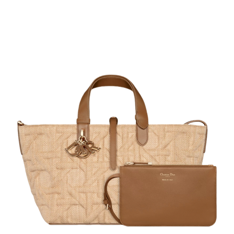 The Dior Toujours bag is distinguished by a casual and practical design. Crafted in beige raffia. it showcases the Graphic Cannage motif. offering a modern 3D version of the House icon. The style features a spacious interior compartment with a matching pouch to organize the essentials. Its thin leather strap closure keeps items secure while the D of the CD Lock clasp twists to adjust the sides and enhance the bag's silhouette. The leather top handles can be adjusted using the small notches so the medium bag can be carried by hand or worn over the shoulder.