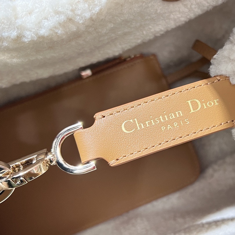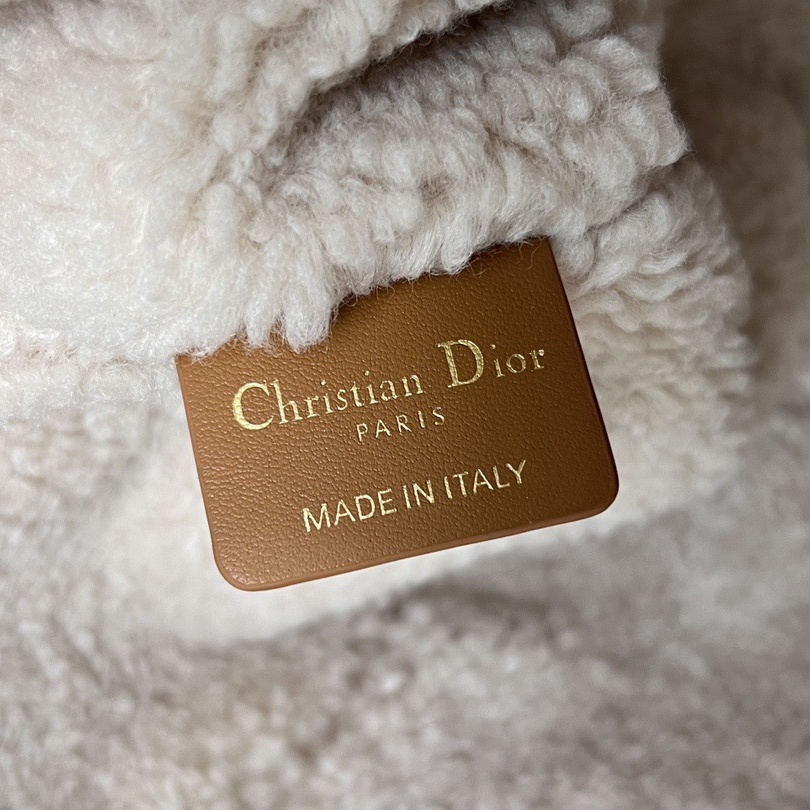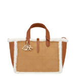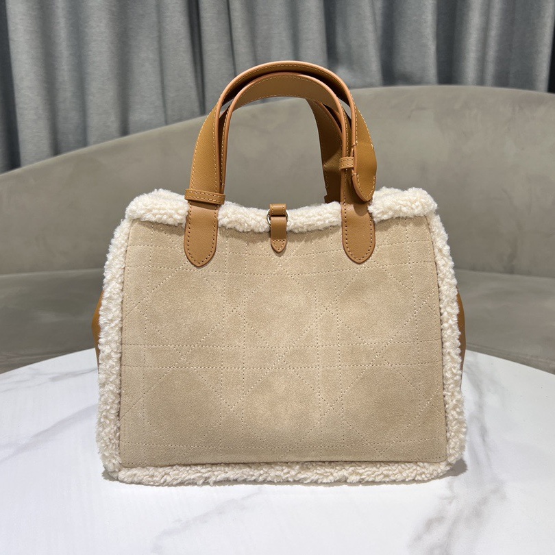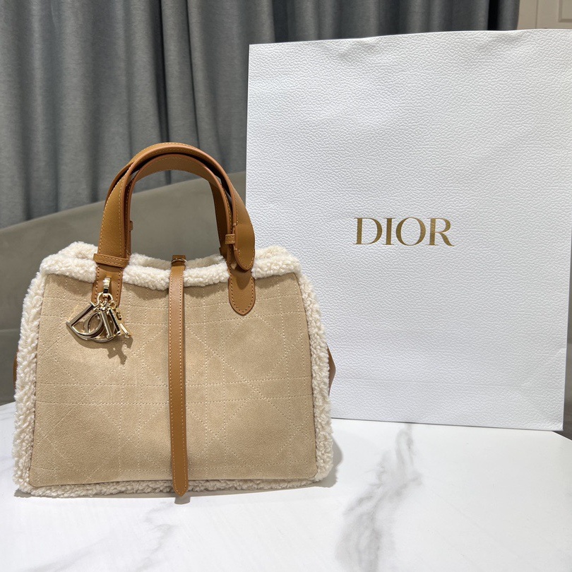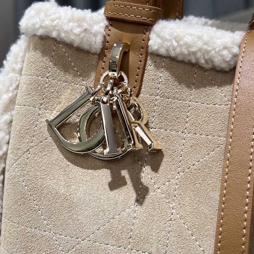 The Dior Toujours bag is distinguished by a casual and practical design. Showcasing Dior's exceptional savoir-faire. it is crafted in beige suede with Macrocannage topstitching and ecru lambskin shearling. It features a spacious interior compartment with a matching pouch to organize the essentials. Its thin leather strap closure keeps items secure while the D of the CD Lock clasp twists to adjust the sides and enhance the bag's silhouette. The leather top handles can be adjusted using the small notches so the medium bag can be carried by hand or worn over the shoulder.