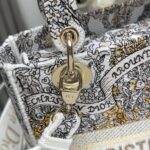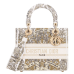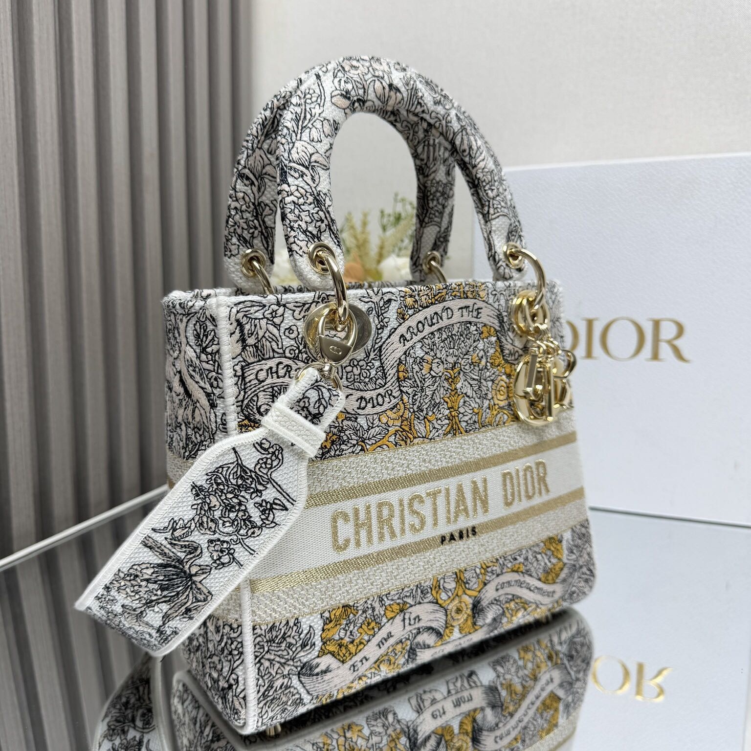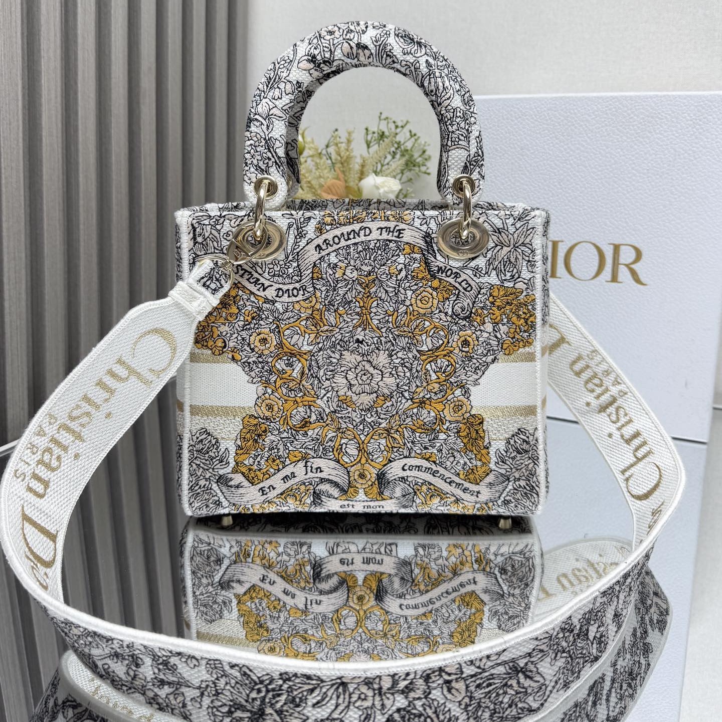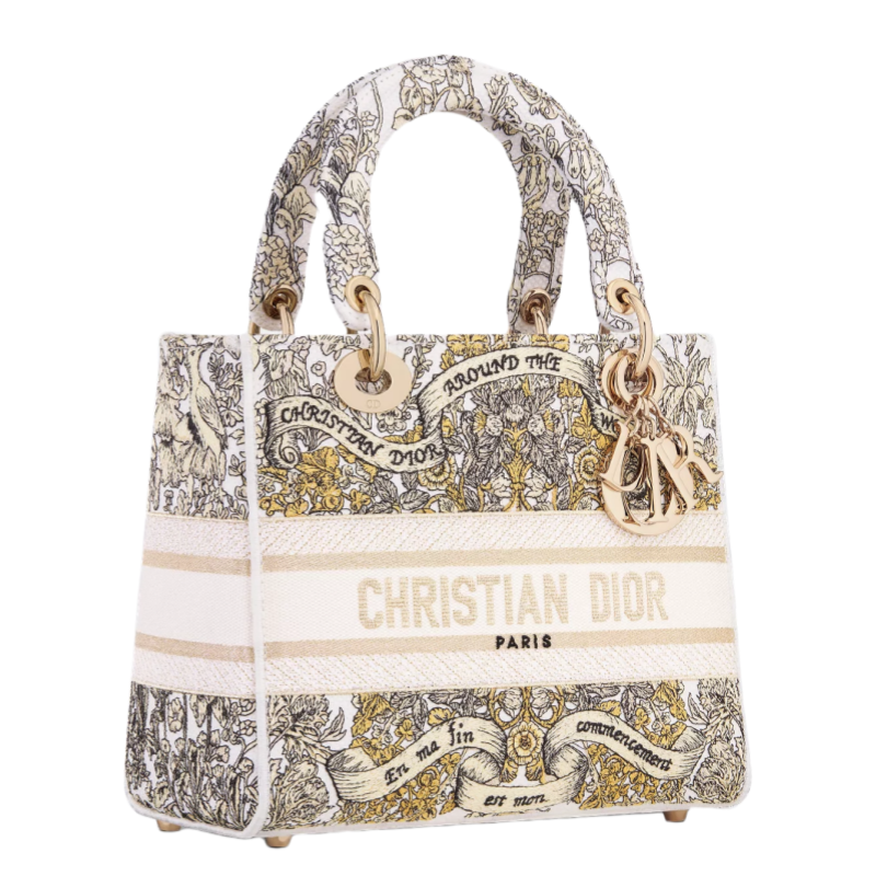 The Lady D-Lite bag combines classic elegance with House modernity. The latte style is fully embroidered with the gold-tone Dior Around the World motif by Pietro Ruffo. showcasing a star decorated with flowers in honor of Scottish heritage. the collection's hallmark theme. and an allegory of the senses with a Marie Stuart quote: En ma fin est mon commencement (In my end is my beginning). The Christian Dior Paris signature adorns the front. while pale gold-finish metal D.I.O.R. charms enhance and illuminate its silhouette. Equipped with a wide. removable embroidered strap. the medium Lady D-Lite bag can be carried by hand or worn crossbody. and it will coordinate with the season's other Dior Around the World creations.