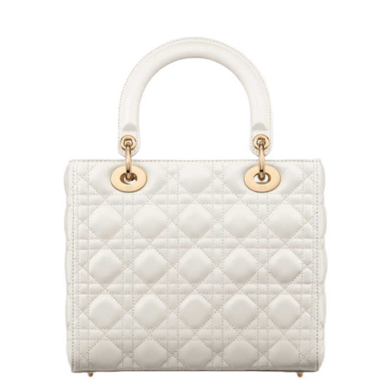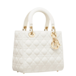 The Lady Dior bag epitomizes the House's vision of elegance and beauty. Sleek and refined. the timeless style is crafted in latte lambskin with Cannage stitching. creating the instantly recognizable quilted texture. Pale gold-finish metal D.I.O.R. charms offer elegant appeal. Featuring a thin. removable leather shoulder strap. the medium Lady Dior bag may be carried by hand or worn crossbody.