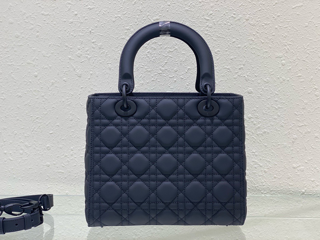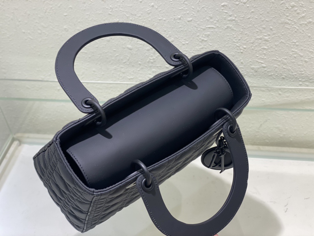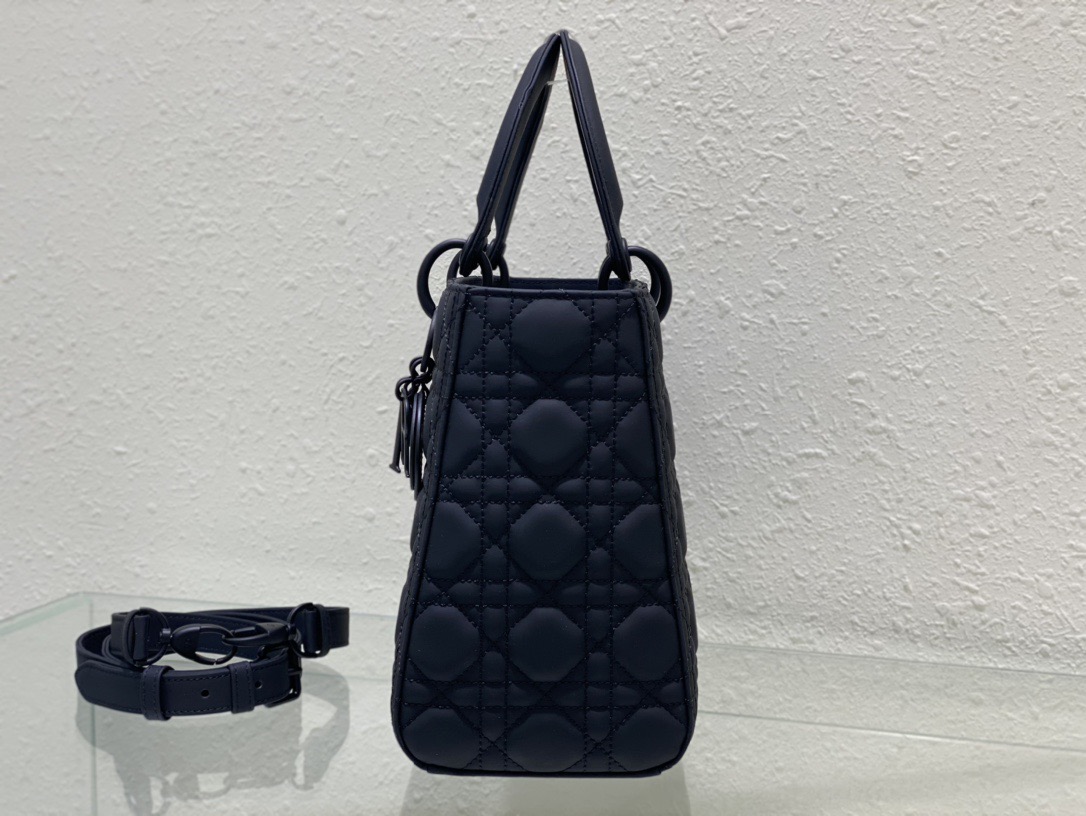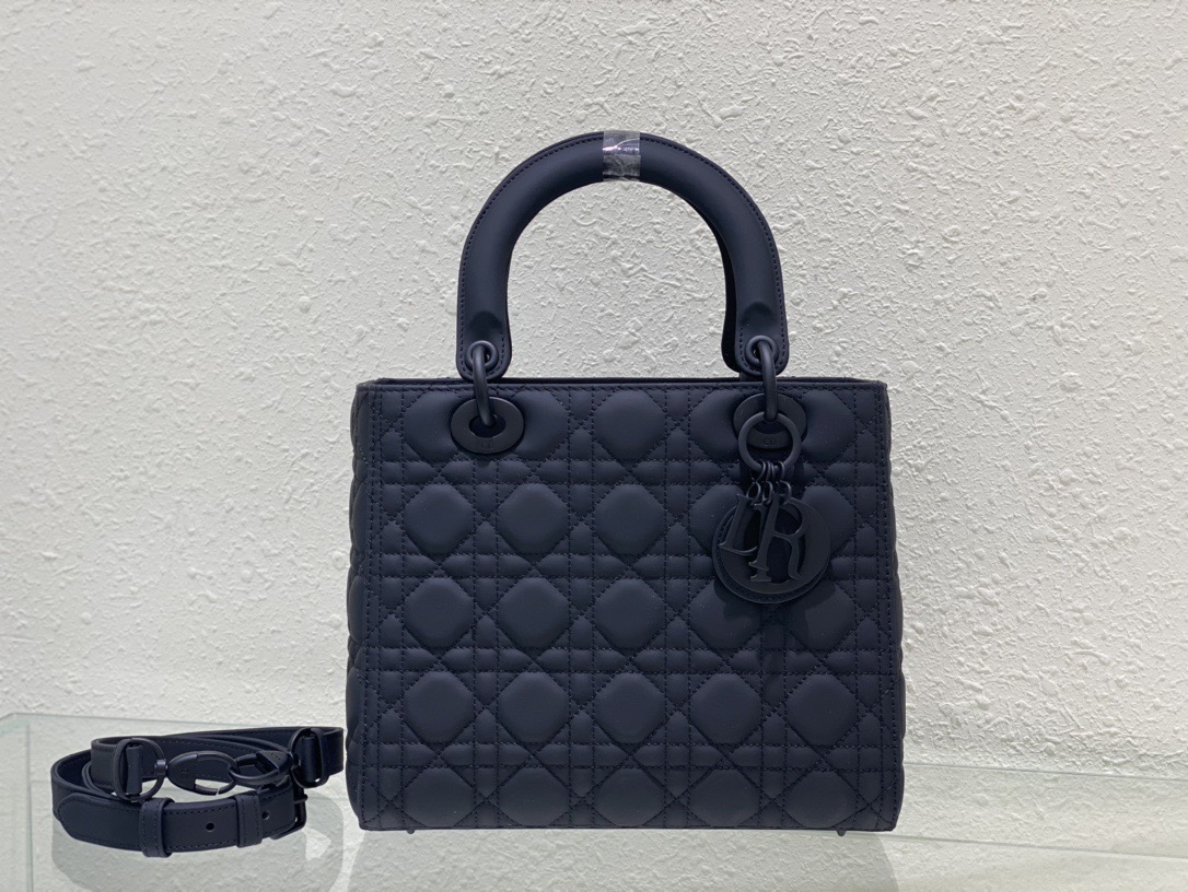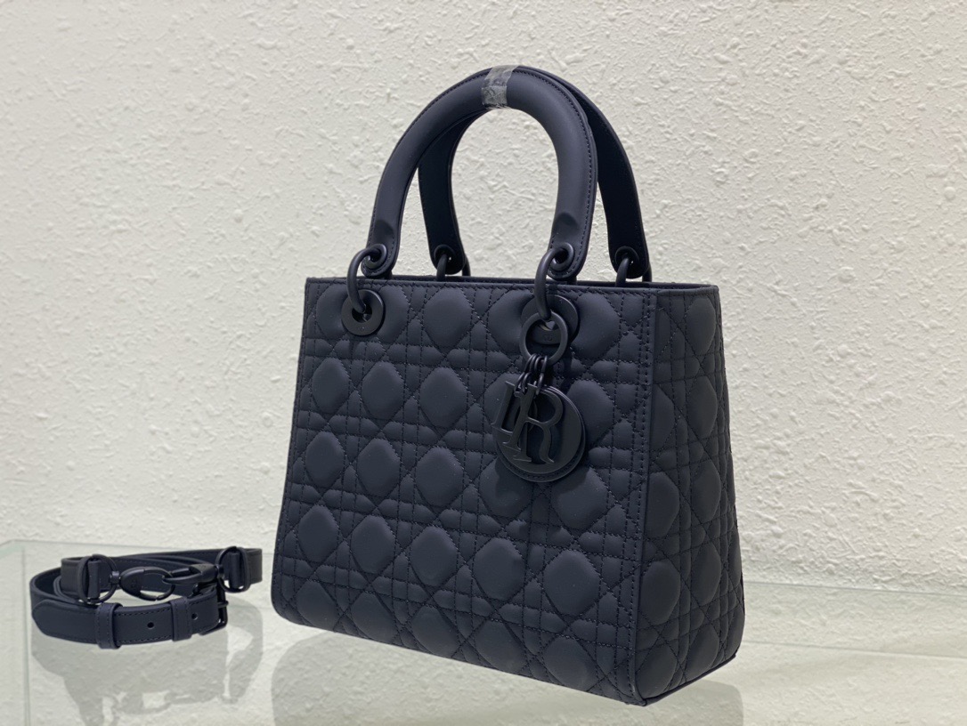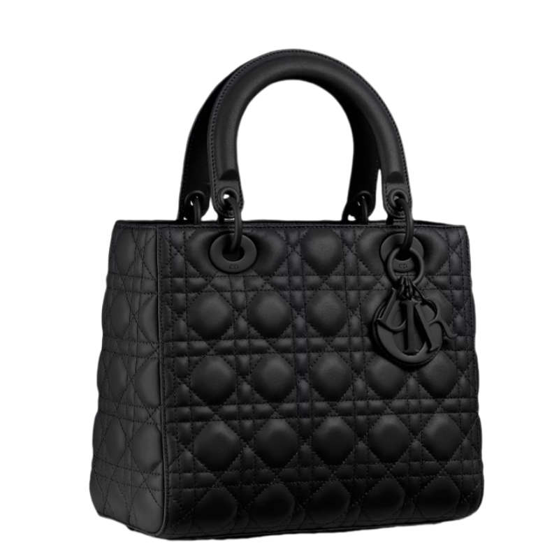 The Lady Dior bag epitomizes the House's vision of elegance and beauty. Sleek and refined. the timeless style is crafted in black ultramatte calfskin with Cannage stitching. creating the instantly recognizable quilted texture. Tonal metal D.I.O.R. complete charms and illuminate the silhouette. Featuring a thin. removable leather strap. the medium Lady Dior bag can be carried by hand. on the shoulder or worn crossbody.