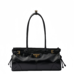 This pragmatic and refined handbag is made of soft leather with a glossy finish that emphasizes its versatile. modern allure. The geometric design blends different influences into one style with a distinctive but sleek aesthetic. Embellished by the sophisticated strap detail. the rectangular silhouette has zipper pockets inside. The enameled metal triangle logo completes the look with its iconic signature.