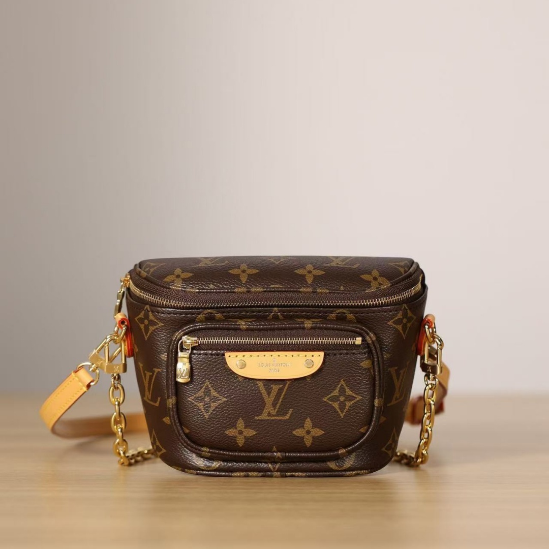 The Mini Bumbag in Monogram canvas is Louis Vuitton's feminine interpretation of the on-trend bumbag format. Designed for versatility. it features a removable. adjustable strap in the House's emblematic natural leather. as well as a removable gold-tone chain. which can be functional or decorative. The bag has a zipped main compartment and a zipped front pocket with an embossed leather tag.