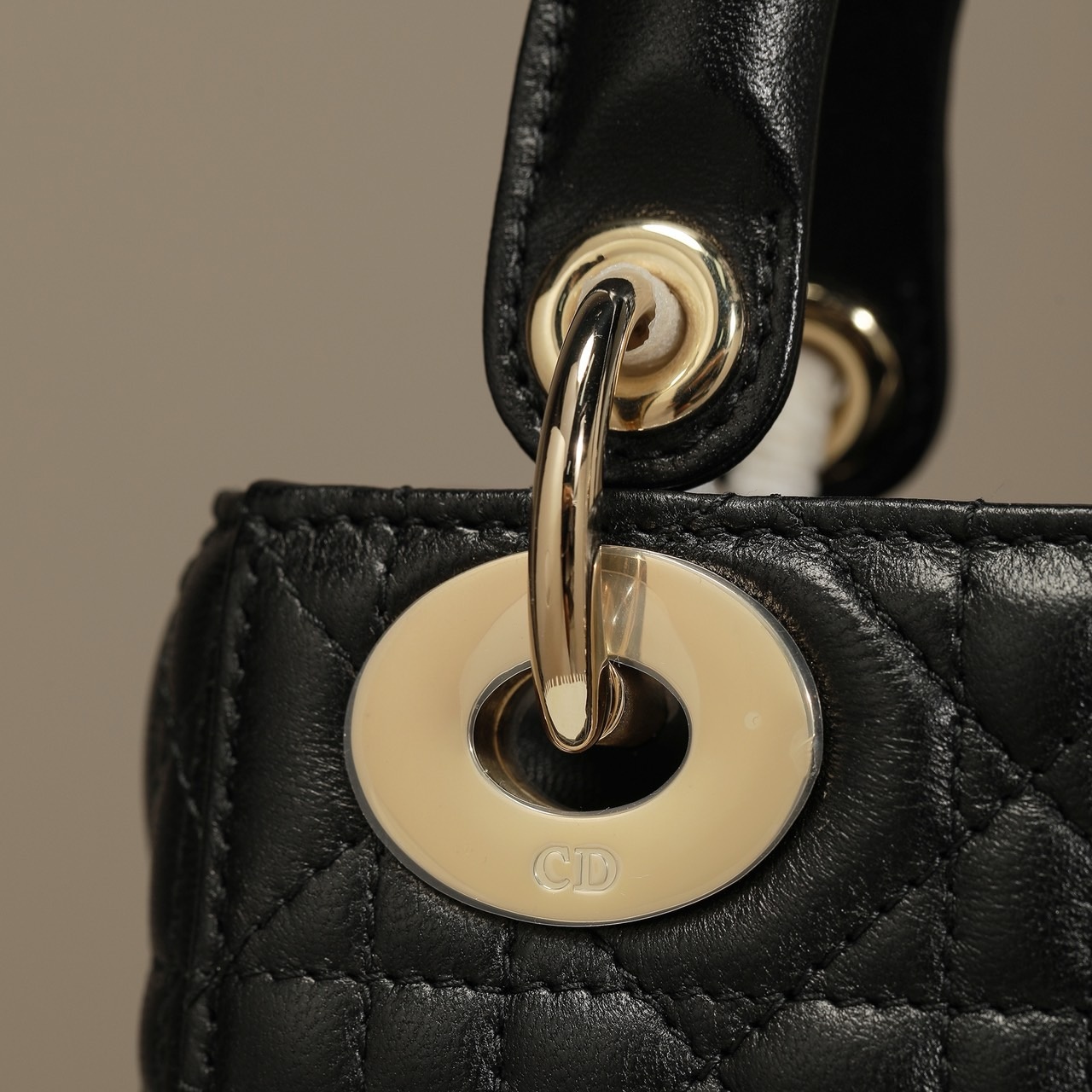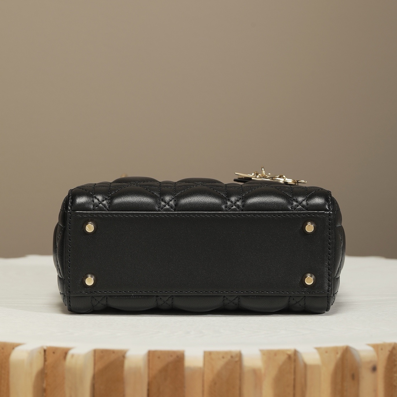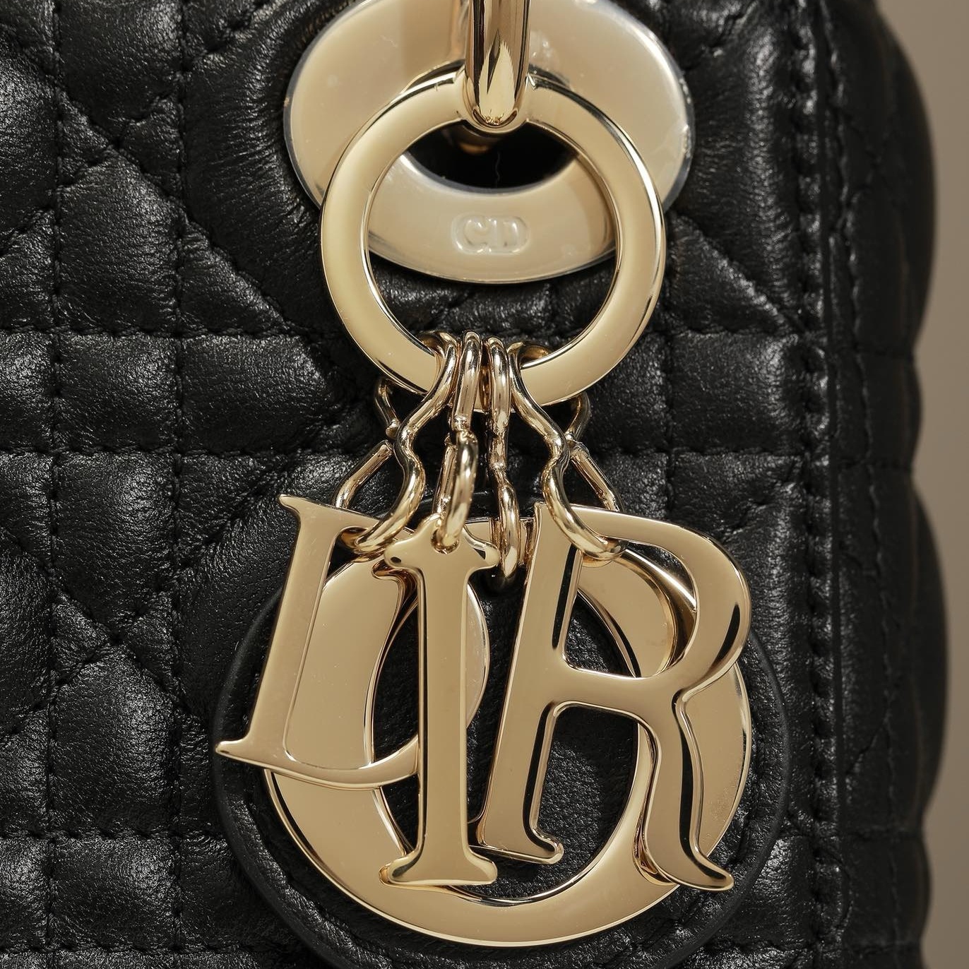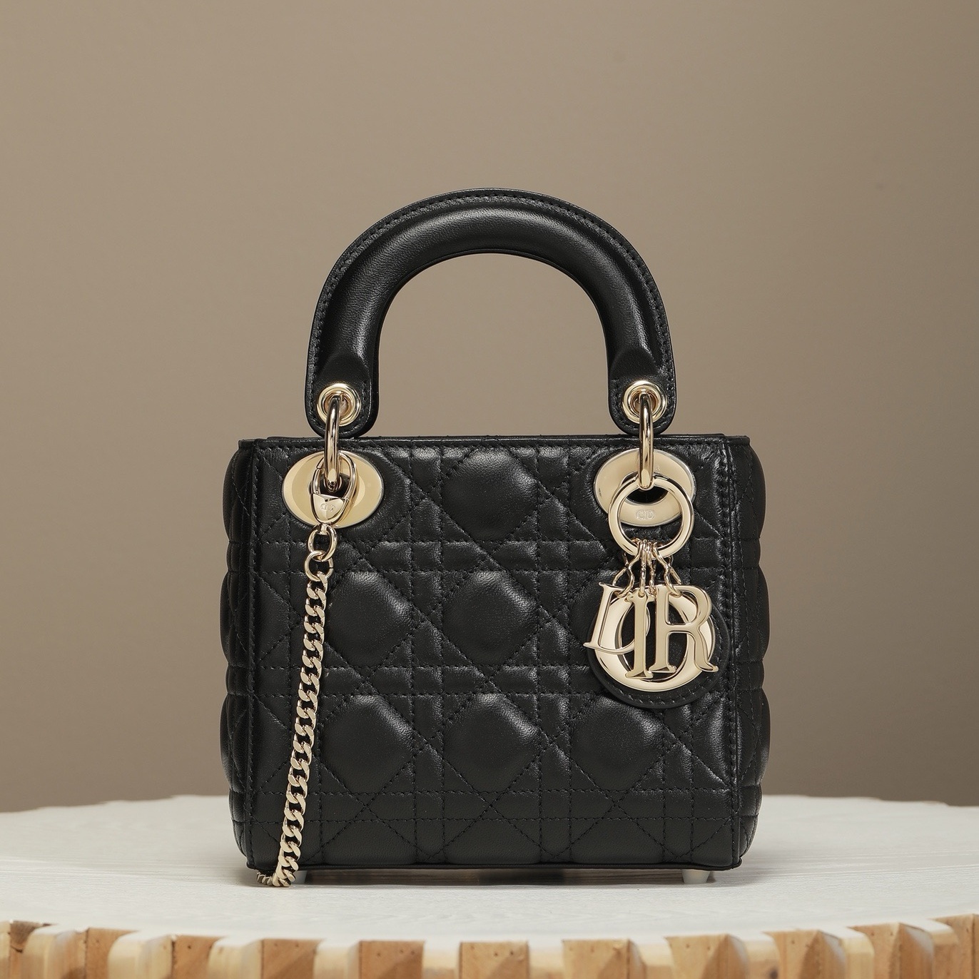 The Lady Dior bag epitomizes the House's vision of elegance and beauty. Refined and sleek. the timeless creation is crafted in black lambskin and covered with Cannage stitching. creating an instantly recognizable quilted texture. The pale gold-finish metal D.I.O.R. charms embellish and illuminate its silhouette. Featuring a removable chain shoulder strap. the miniature Lady Dior bag can be carried by hand or worn crossbody as an ideal evening wear companion.