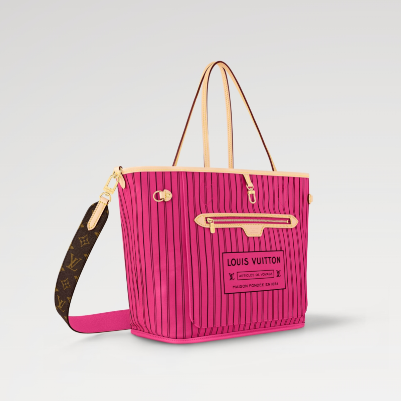 Offered in a new reversible design. the iconic Neverfull Bandoulière Inside Out MM tote is a timeless choice. This edition is made from Monogram canvas and has a brightly colored textile that's patterned with stripes. It also features a removable strap that allows for shoulder carry. Use the side hooks to transform it into a hobo silhouette.