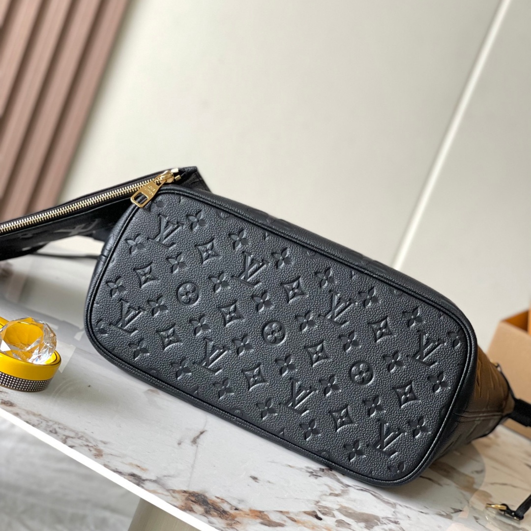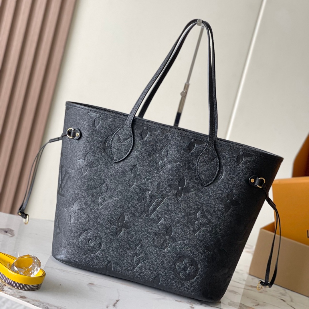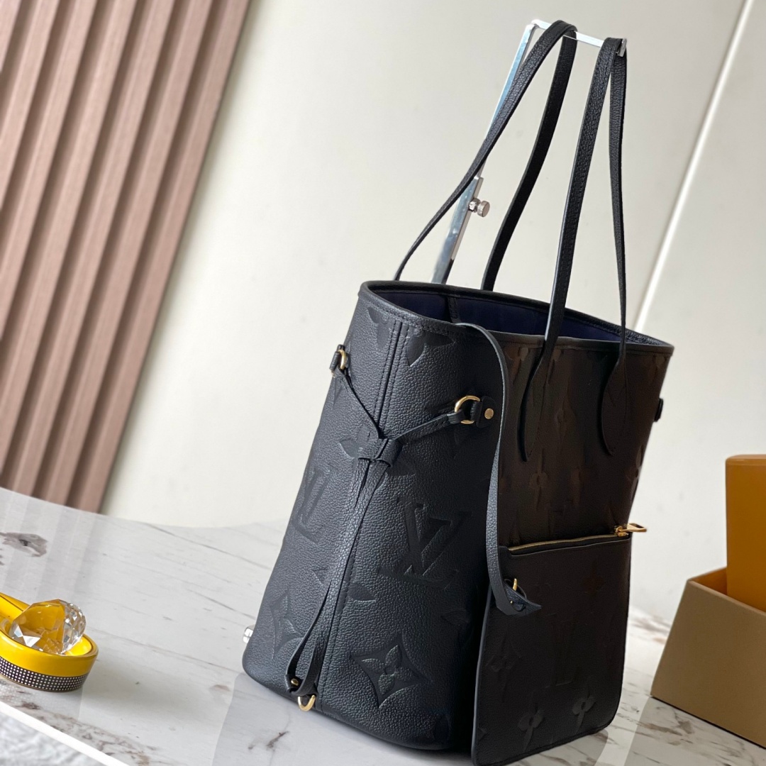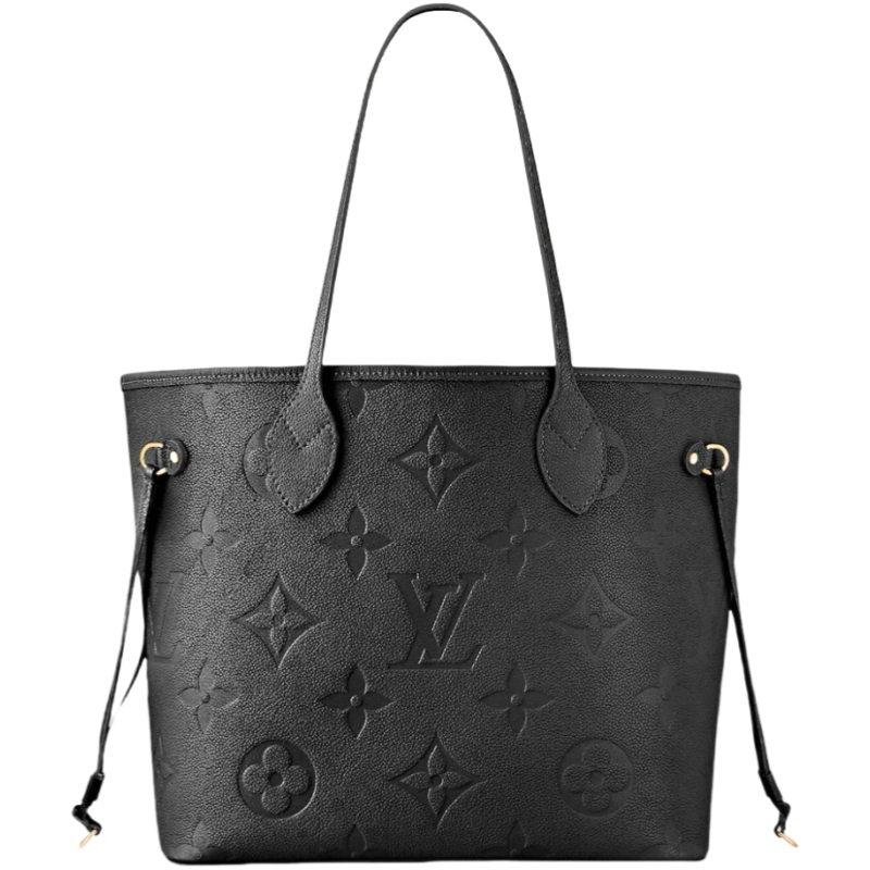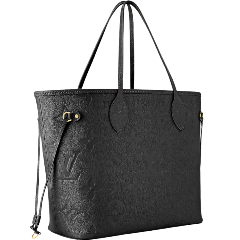 The essential Neverfull MM tote now comes in embossed Monogram Empreinte leather. Its generous dimensions make this bag ideal for everyday use while the long shoulder handles and supple leather mean it's comfortable to carry. With the side laces cinched. this roomy carryall becomes a stylish city bag. It can be worn over the shoulder or on the elbow.