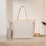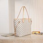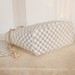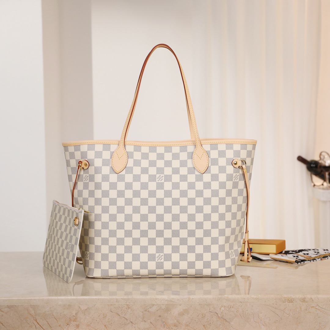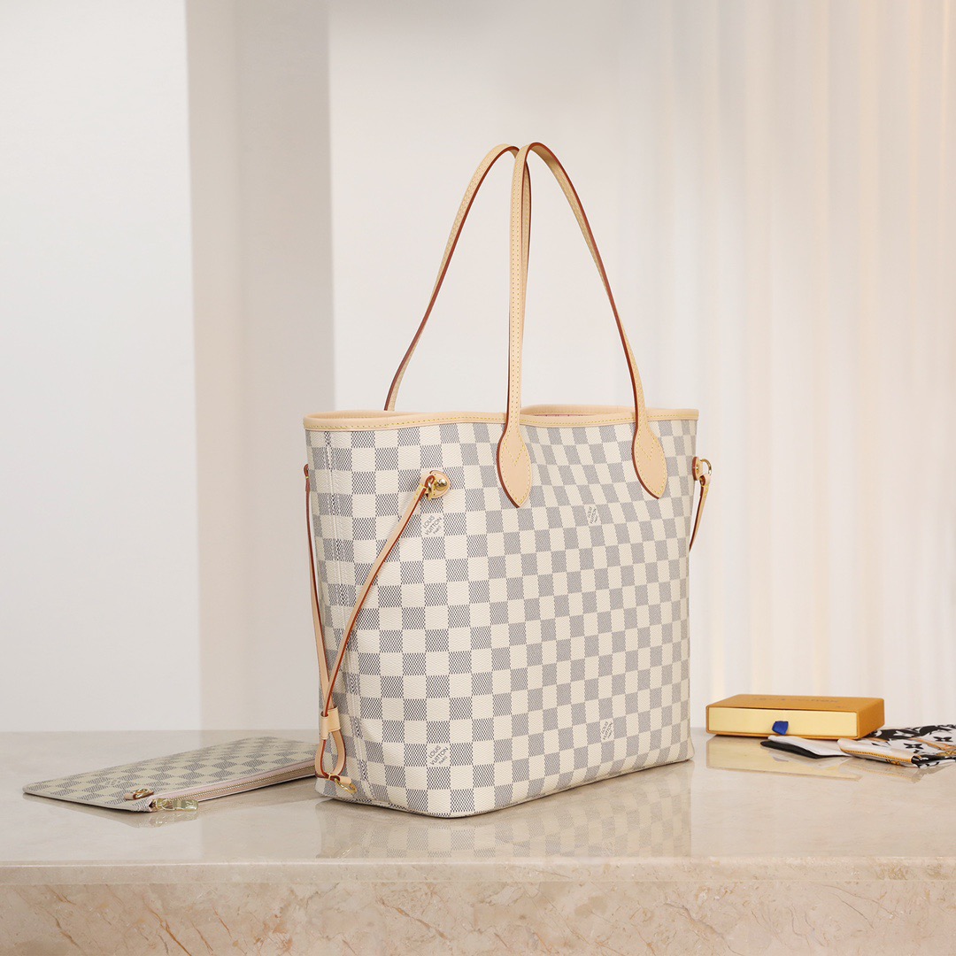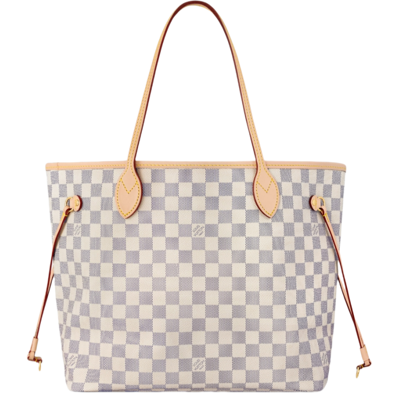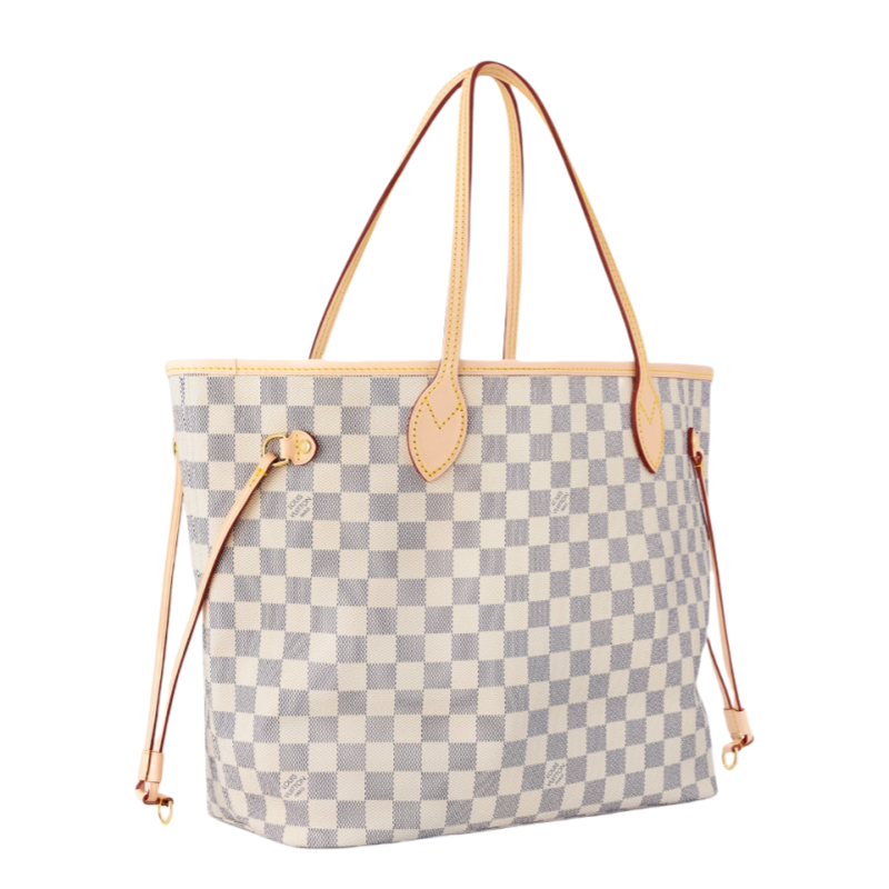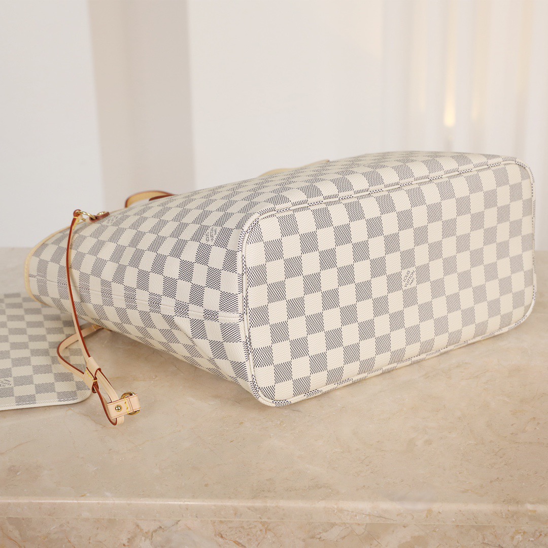 The Neverfull MM tote unites timeless design with heritage details. Made from fresh Damier Azur canvas with natural cowhide trim. it is roomy yet not bulky. with side laces that cinch for a sleek allure or loosen for a casual look. The slim leather handles slip easily over the shoulder or arm. Lined in colorful textile. it features a removable pouch which can be used as a clutch or an extra pocket.