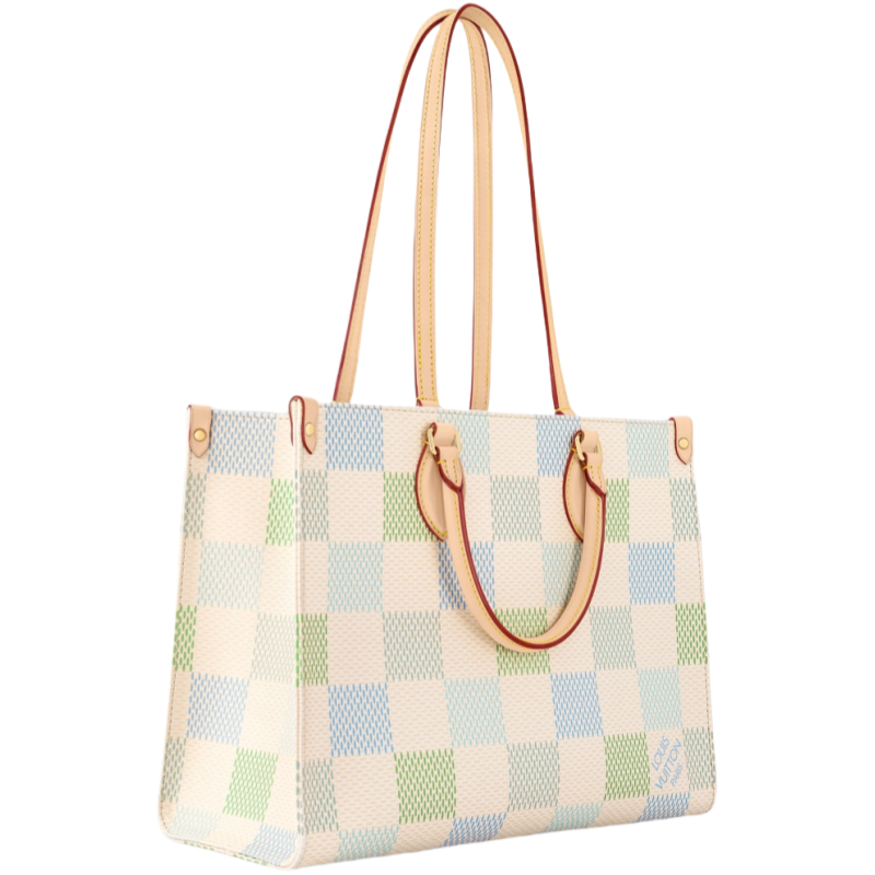 The OnTheGo MM tote bag is made from Damier Giant canvas in a charming colorway that combines four different pastel shades. In addition to two top handles in natural leather. there are two longer straps mounted inside the bag for shoulder carry. Large enough for a 13-inch laptop. this is a practical everyday bag.