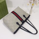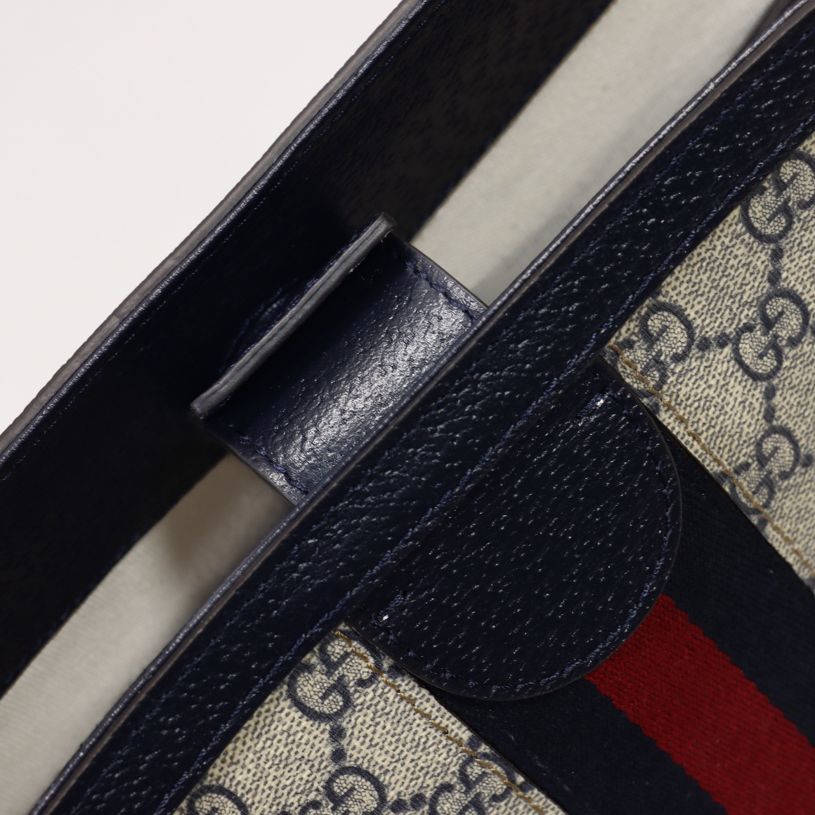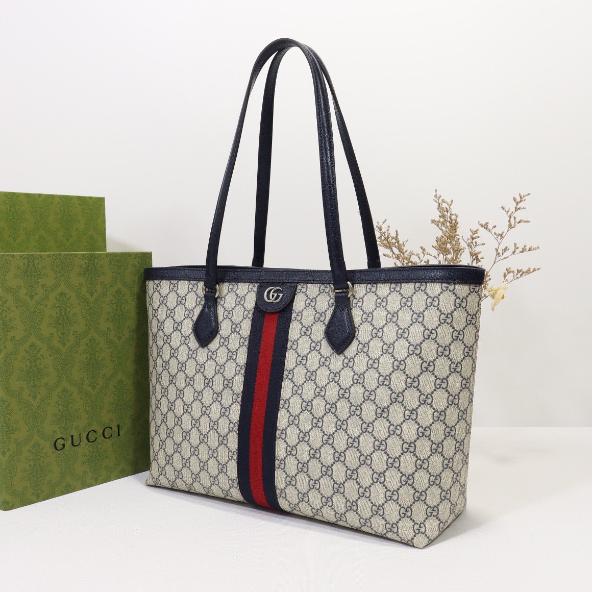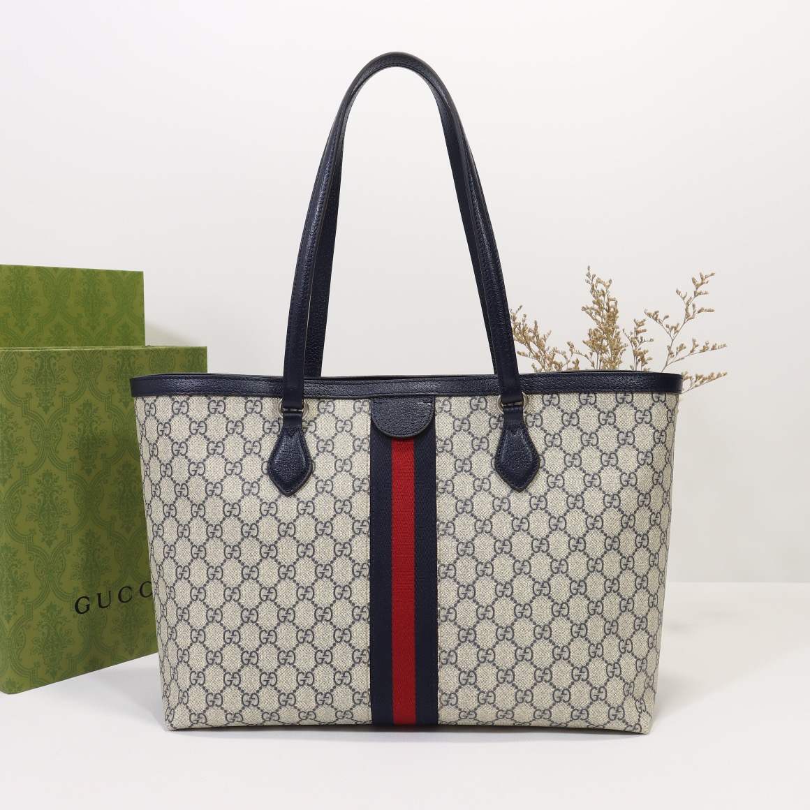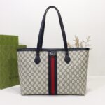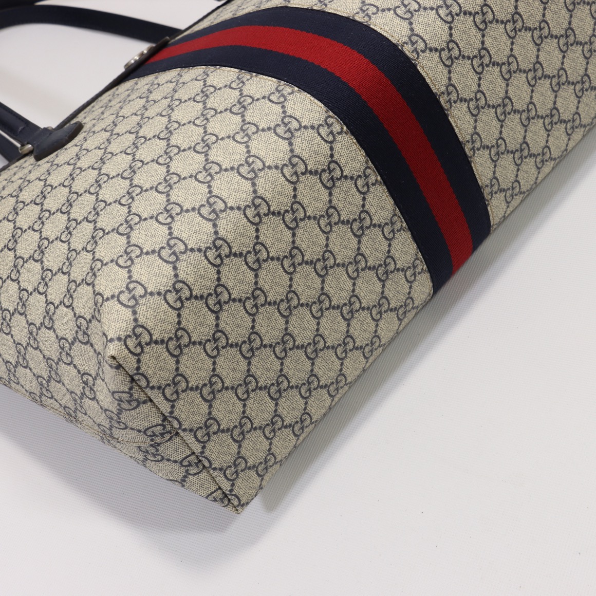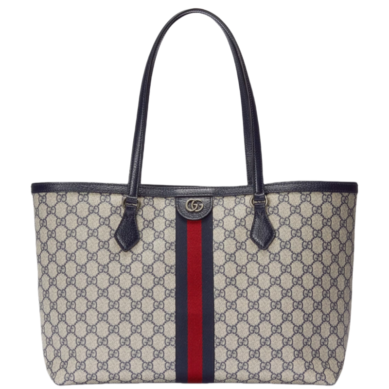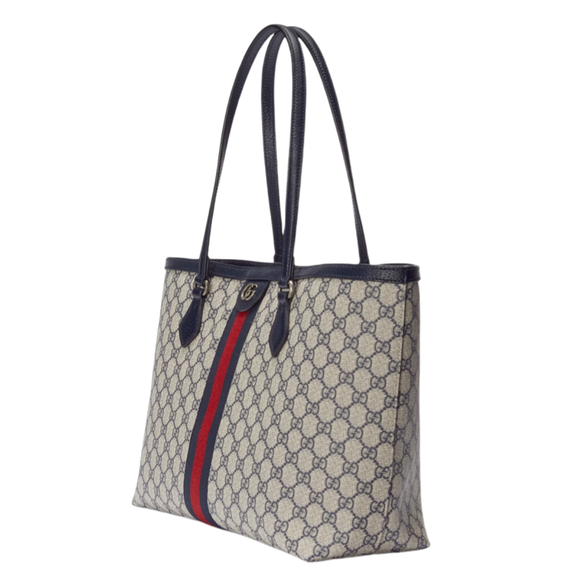 Mirroring the material's historic origins. GG Supreme is introduced in a timeless mix of blue and beige for Gucci Love Parade. The canvas has come to the front of each collection decade after decade to become a hallmark of the House. Here. the classic palette defines this medium-sized Ophidia tote bag. completed by the Web stripe in red and blue.