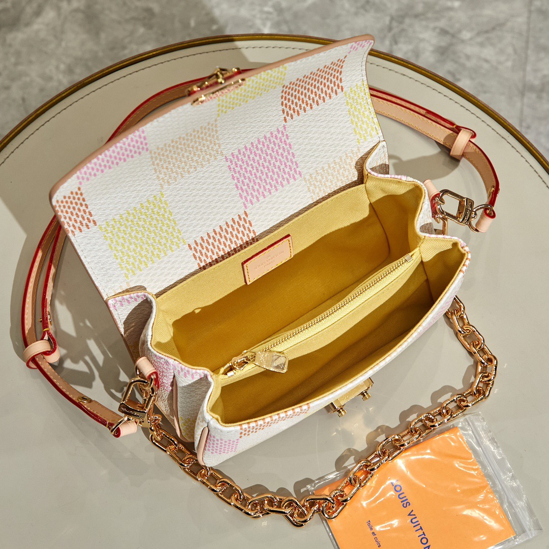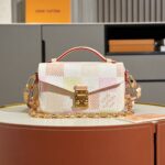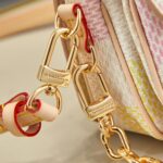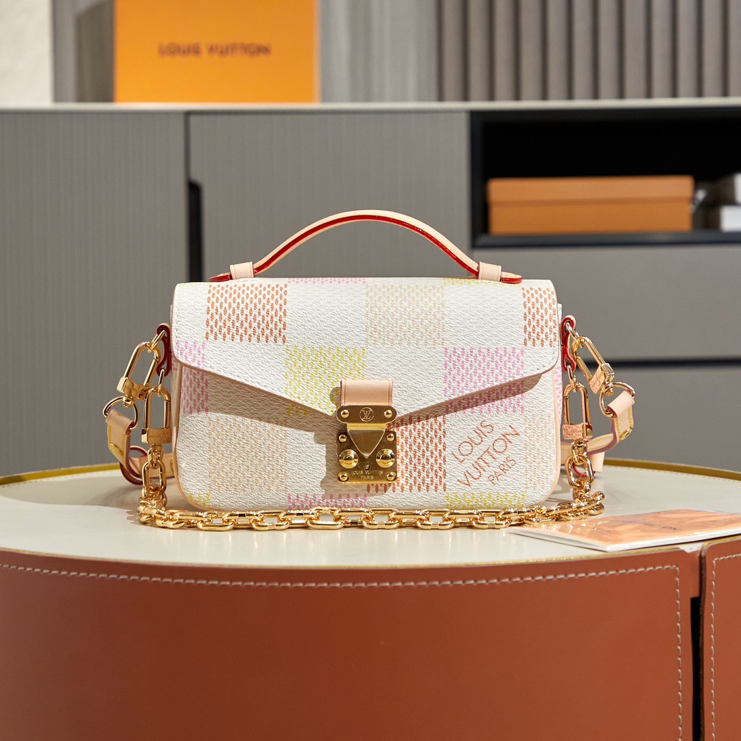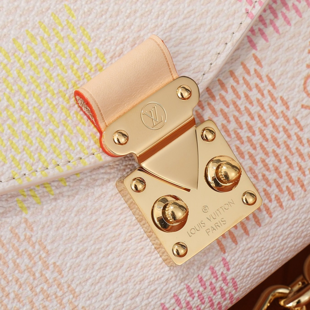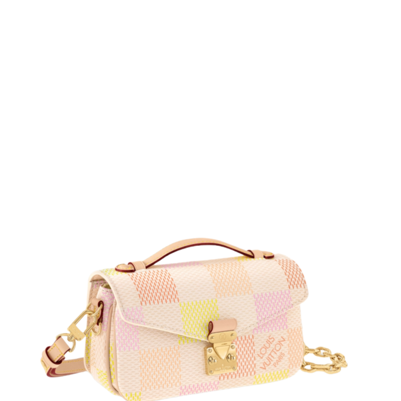 Fashioned from Damier Giant canvas in a pastel colorway. the Pochette Métis East West takes part in the Damierlicious capsule. This stylish shapes features an S-lock and removable short chain. both with a golden finish. The organized interior and the adjustable and removable leather strap make this compact bag perfect for women on the go.