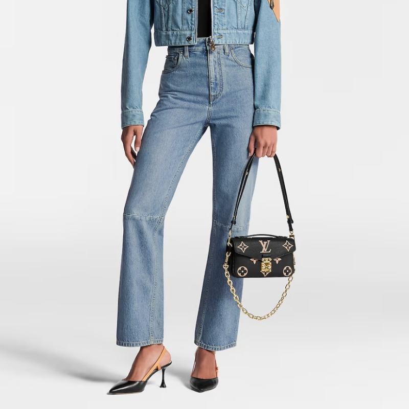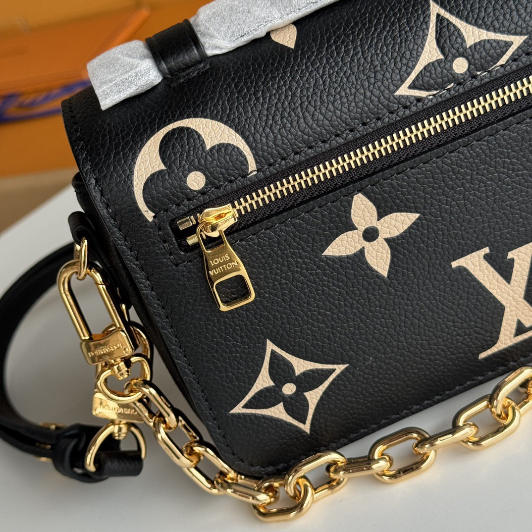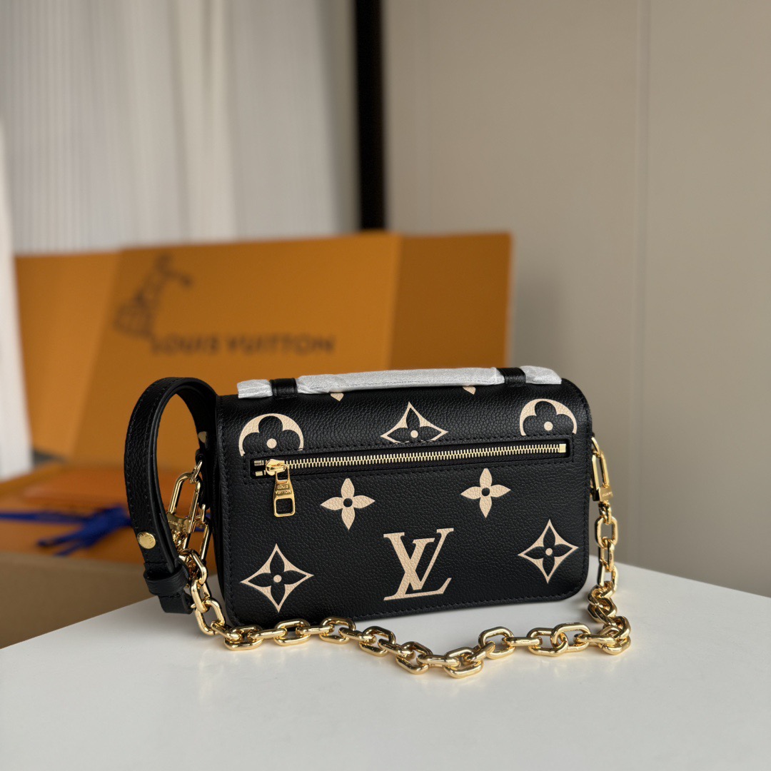 Crafted from embossed Monogram Empreinte leather. the bicolor East-West edition of the Pochette Métis sports an oversized version of the signature motif. At once sophisticated and squarely on-trend. this versatile day-to-evening bag can be worn on the shoulder with its detachable golden chain. cross-body with the adjustable smart strap. or carried by hand thanks to the chic top handle.