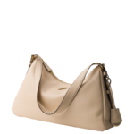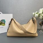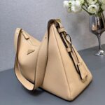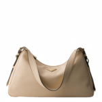 The sophisticated minimalism of the '90s inspires the new Prada Aimée bag. portrayed in the Fall/Winter 2024 Campaign. The design evokes the instinctive gesture of holding a bag with its soft silhouette. created for effortless wear on the shoulders or cross-body.