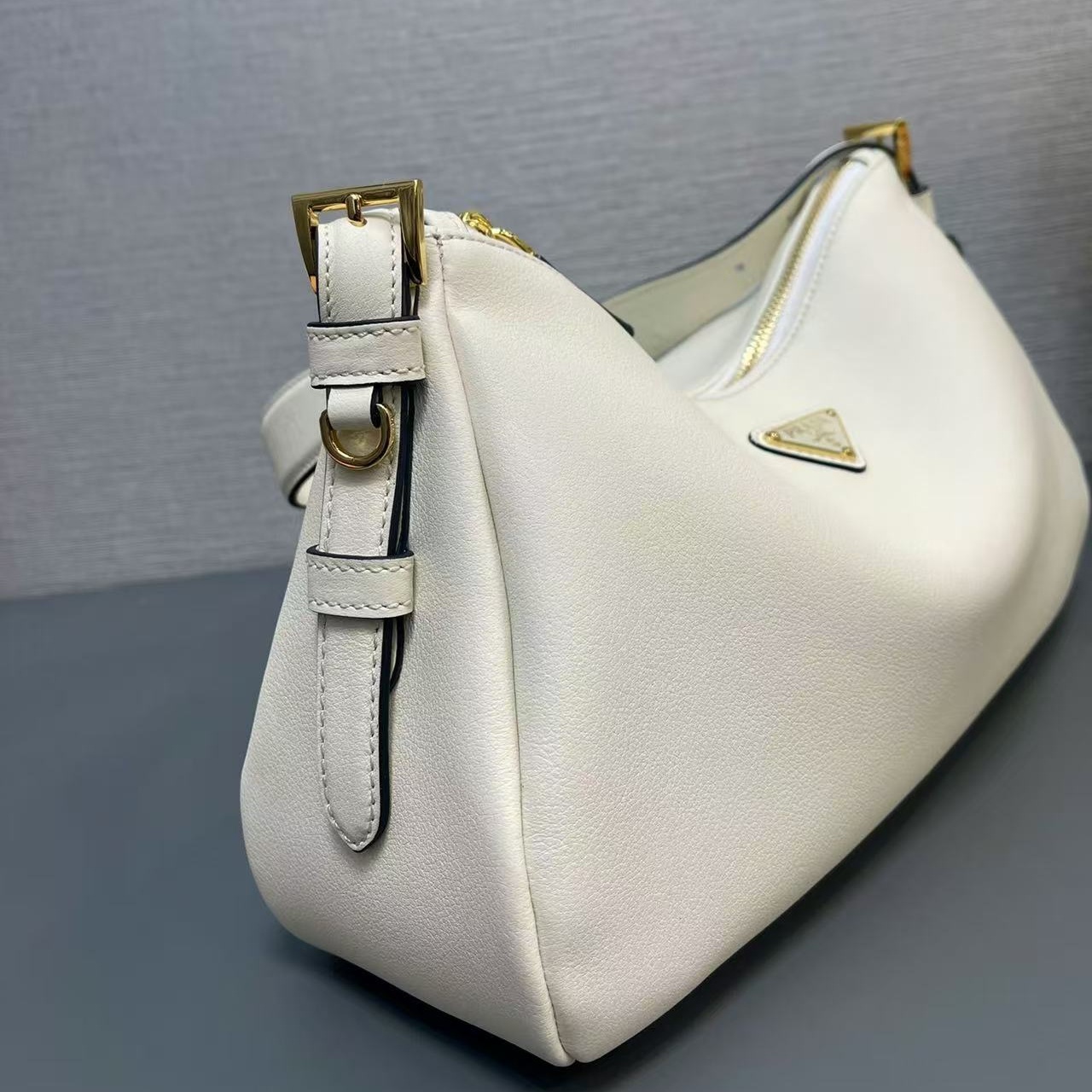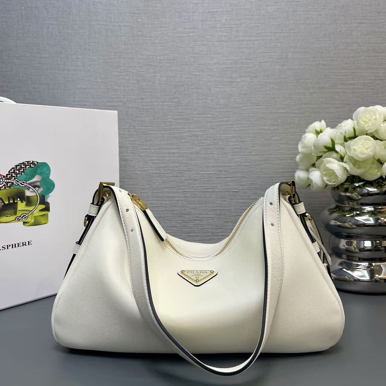 The sophisticated minimalism of the '90s inspires the new Prada Aimée bag. portrayed in the Fall/Winter 2024 Campaign. The design evokes the instinctive gesture of holding a bag with its soft silhouette. created for effortless wear on the shoulders or cross-body.