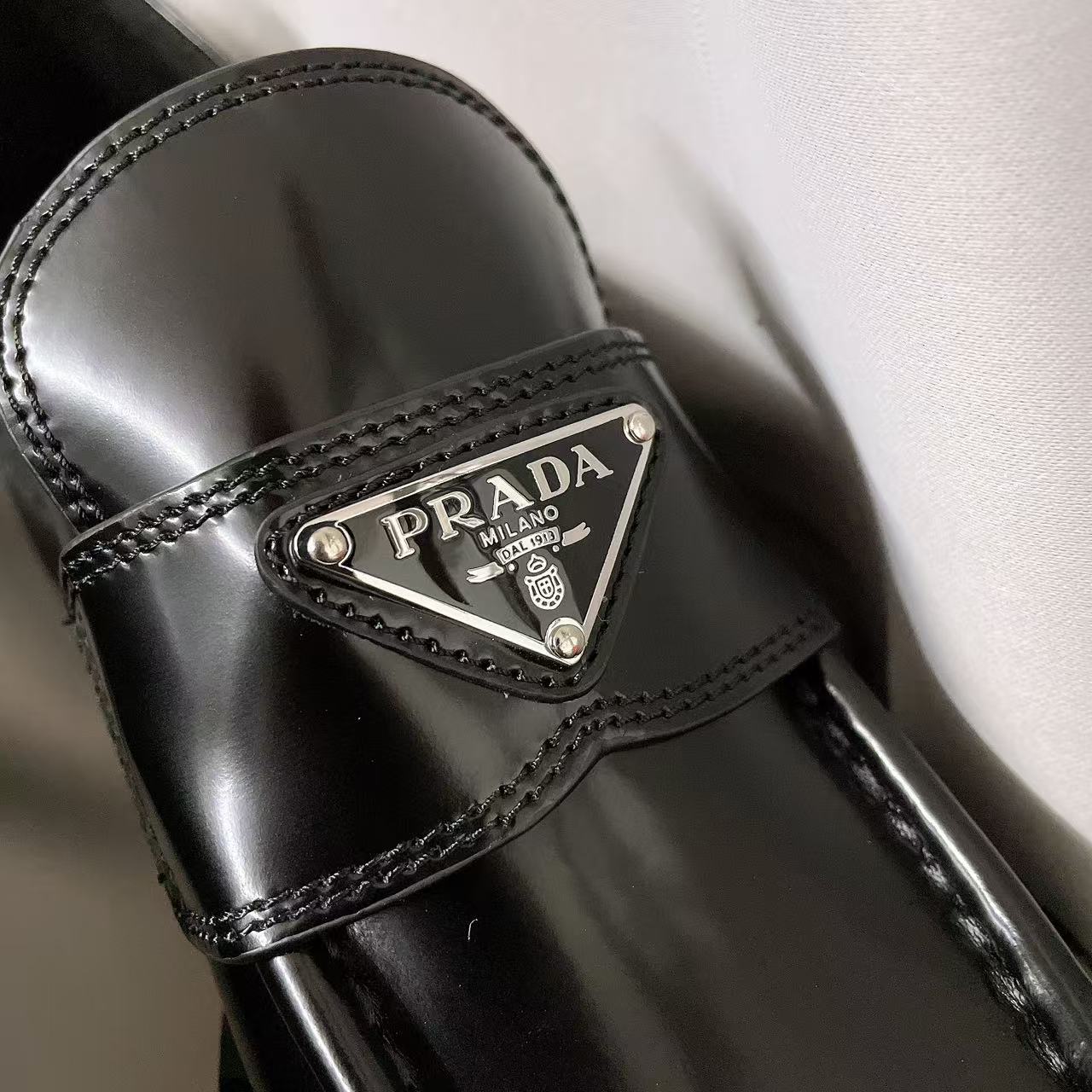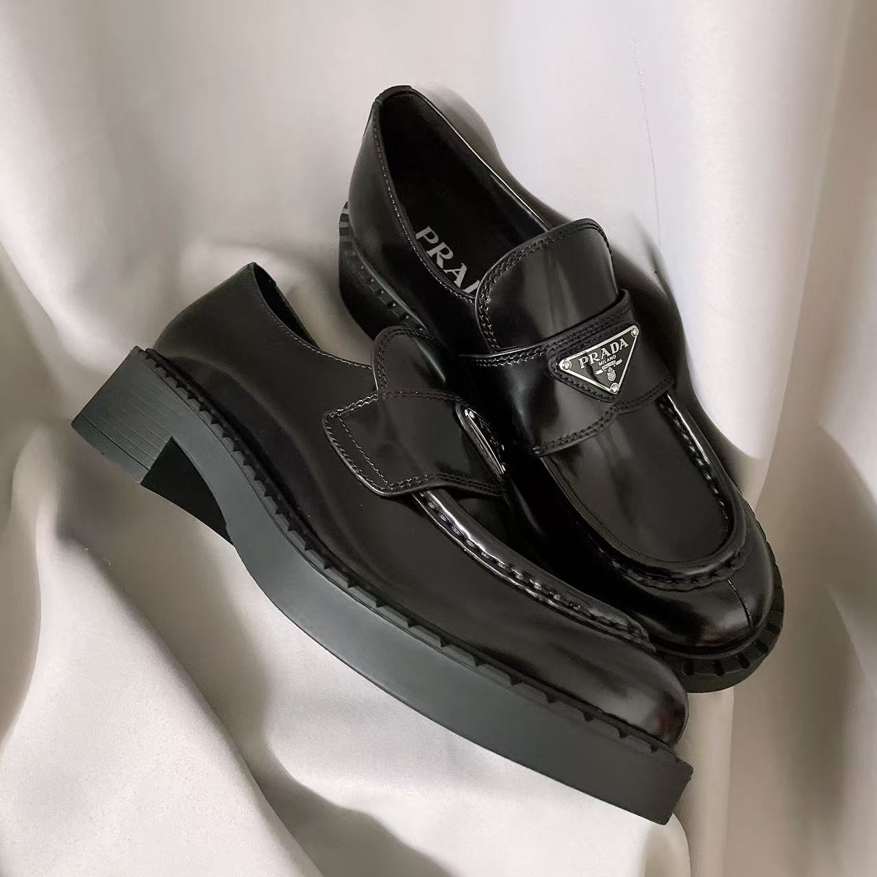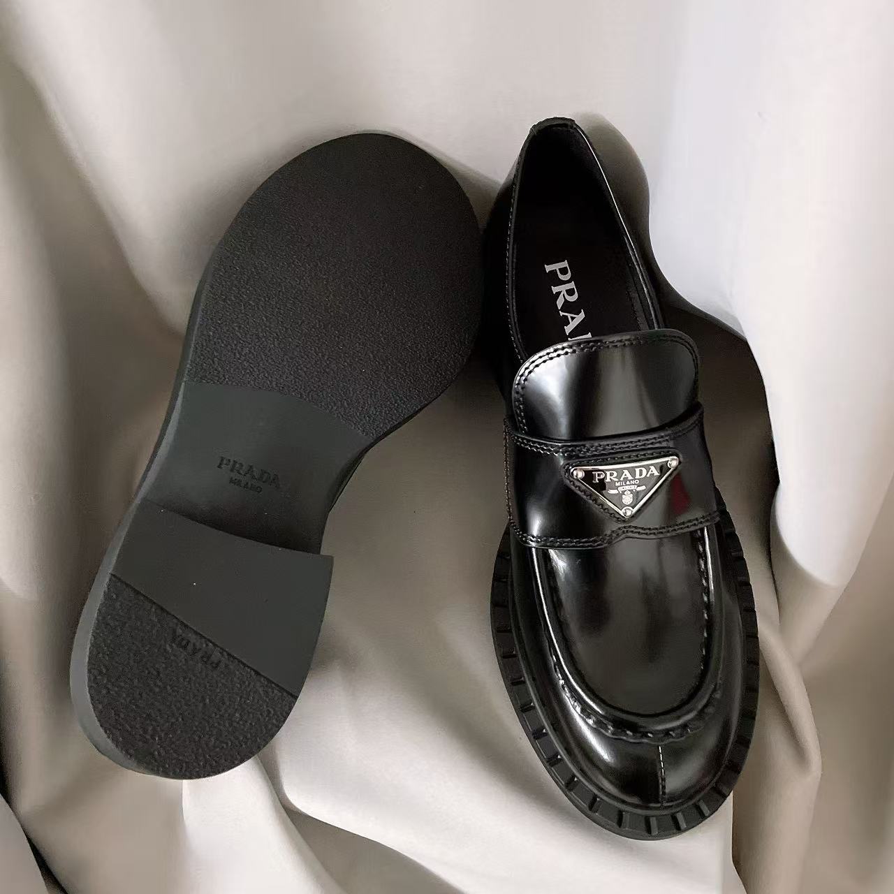 PRADA MONOLITH Fashionable and casual patent leather single shoes, Le Fu shoes for women