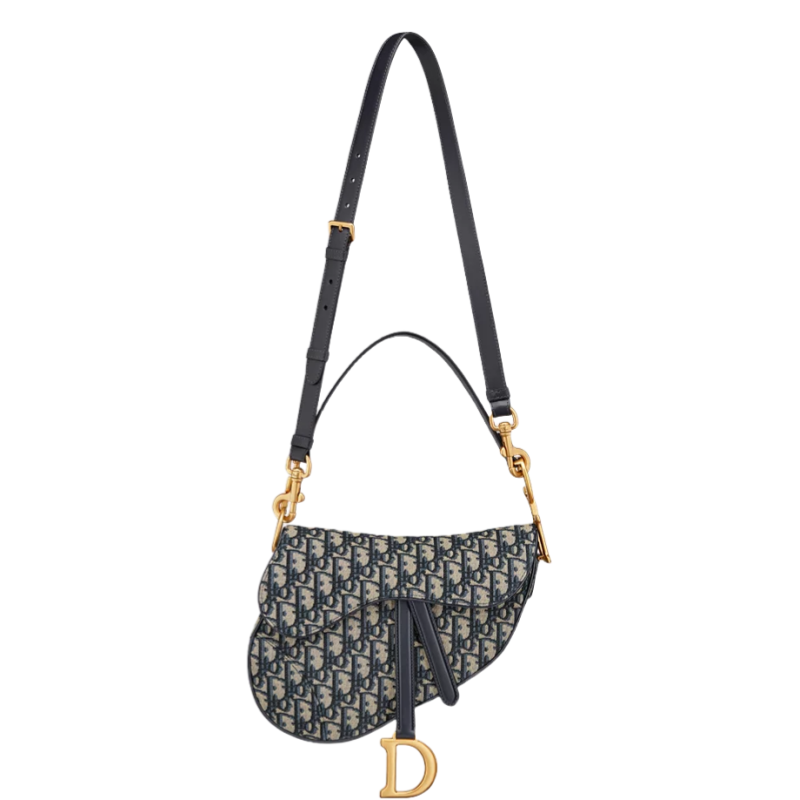 Maria Grazia Chiuri brings a fresh update to the iconic Saddle bag. Crafted in blue Dior Oblique jacquard. the legendary design features a Saddle flap with a D stirrup clasp on a magnetic strap. as well as an antique gold-finish metal CD signature on either side of the strap. Equipped with a thin. adjustable and removable shoulder strap. the Saddle bag may be carried by hand. worn over the shoulder or crossbody.