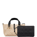 The Dior Toujours bag is distinguished by a casual and practical design. Crafted in rope beige calfskin with Macrocannage topstitching and black calfskin detailing. it showcases a spacious interior compartment with a matching pouch to organize the essentials. Its thin leather strap closure keeps items secure while the D of the CD Lock clasp twists to adjust the sides and enhance the bag's silhouette. Equipped with leather top handles that can be adjusted using the small notches. the small bag can be effortlessly carried by hand.