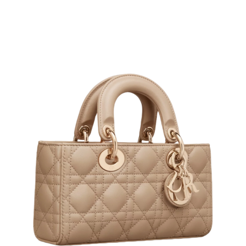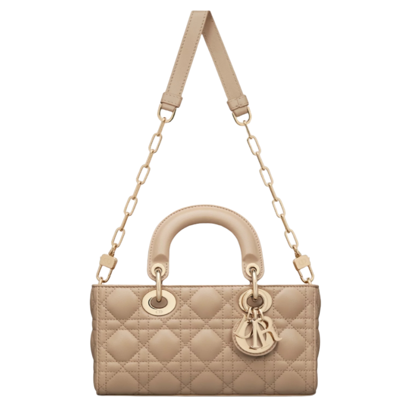 The Lady D-Joy bag captures the House's vision of elegance and beauty by showcasing the iconic streamlined aesthetic of the Lady Dior line. Crafted in biscuit lambskin with Cannage stitching. the refined and timeless style is enhanced by pale gold-finish metal D.I.O.R. charms elegantly embellishing its silhouette. Featuring one removable chain strap and another adjustable and detachable leather strap. the small Lady D-Joy bag can be carried by hand. worn over the shoulder or crossbody as a daily companion.