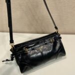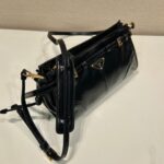 Pragmatic and refined. this shoulder bag has a sleek. modern design emphasized by soft leather with a unique glossy finish. a symbol of Prada's artisan know-how. The rectangular silhouette framed by an elegant strap detail is characterized by the nappa interior with center zipper pocket. The detachable. adjustable shoulder strap completes the versatile accessory decorated with the iconic enameled metal triangle logo.
