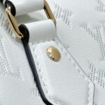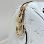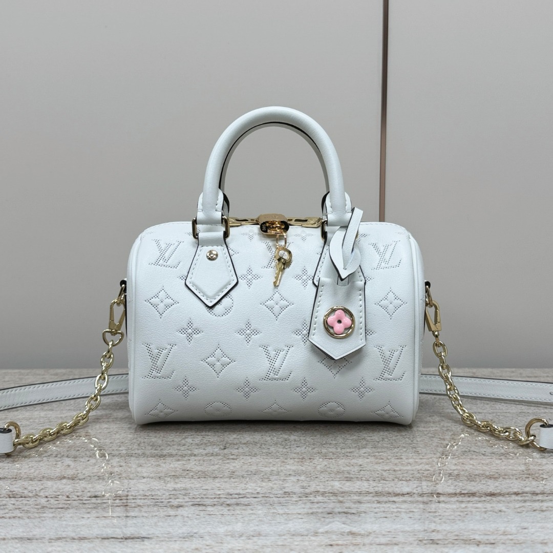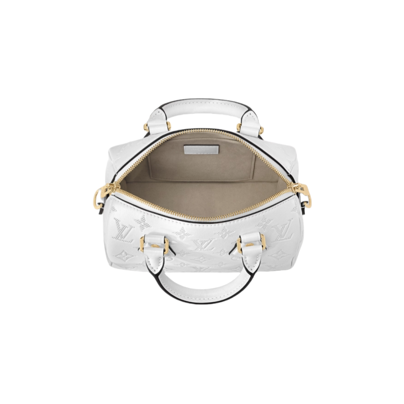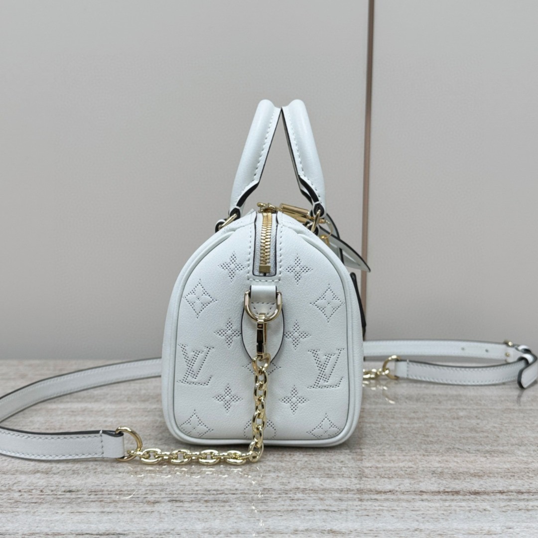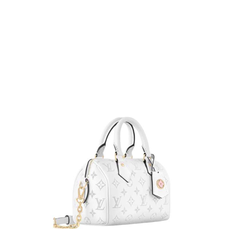 This Speedy Bandoulière 20 handbag is made from smooth calfskin leather. with the Monogram pattern in embossed trompe l'oeil perforation. Pale gold-color hardware and a name tag with a Monogram Flower complete the picture. Rolled-leather handles and a removable and adjustable strap enable a variety of carries.