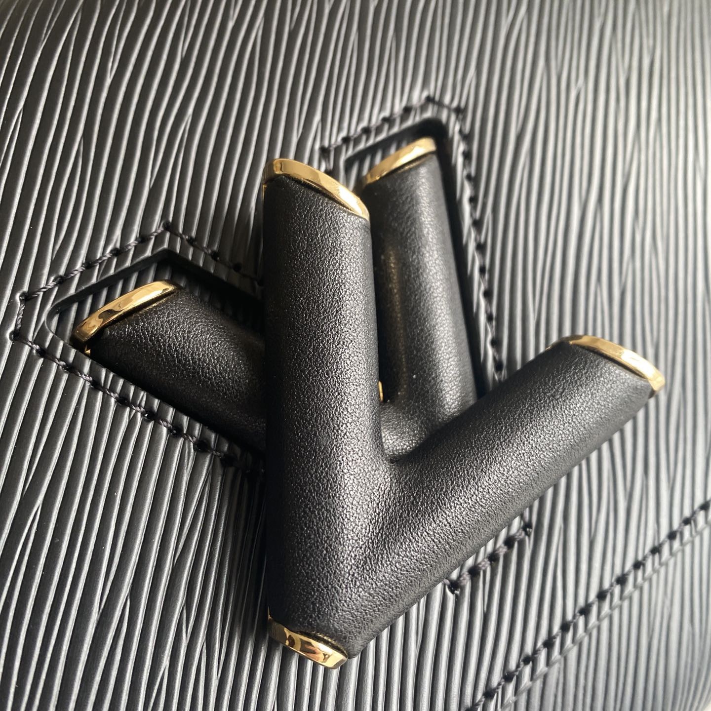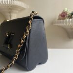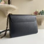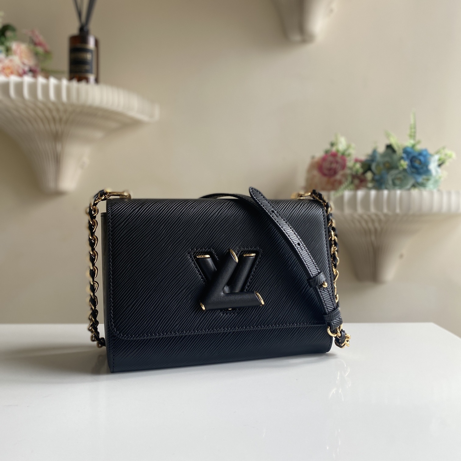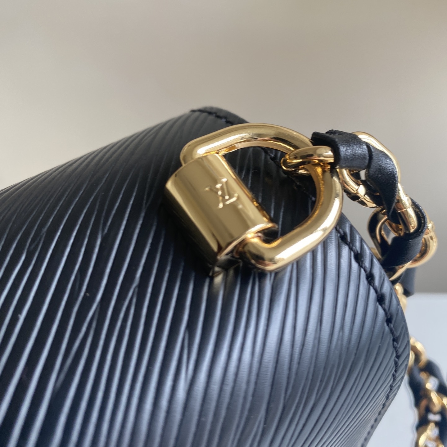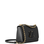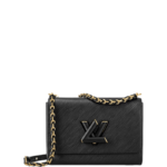 Crafted from the House's emblematic Epi leather. the Twist MM chain bag features the now-iconic LV Twist lock. The Twist MM handbag is reinterpreted in a monochromatic colorway of black on black. Fashioned from black Epi leather. the bag has a LV turn-lock finished in matte tone-on-tone lacquering. Soft leather is braided into the metallic links of the chain strap for unexpectedly sophisticated look. An adjustable shoulder pad in leather assures comfortable carry.