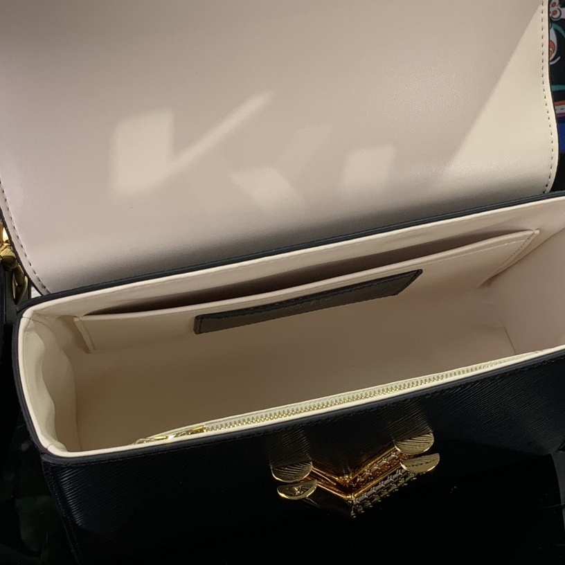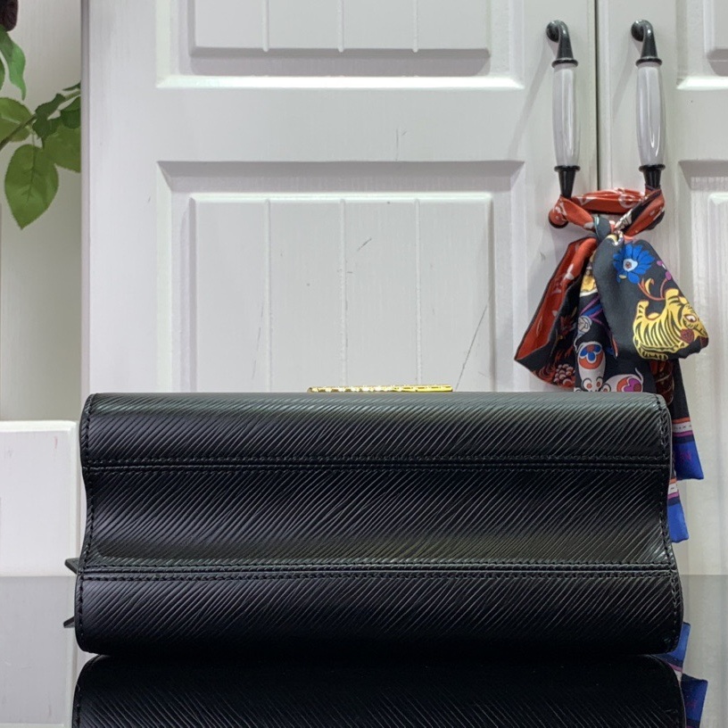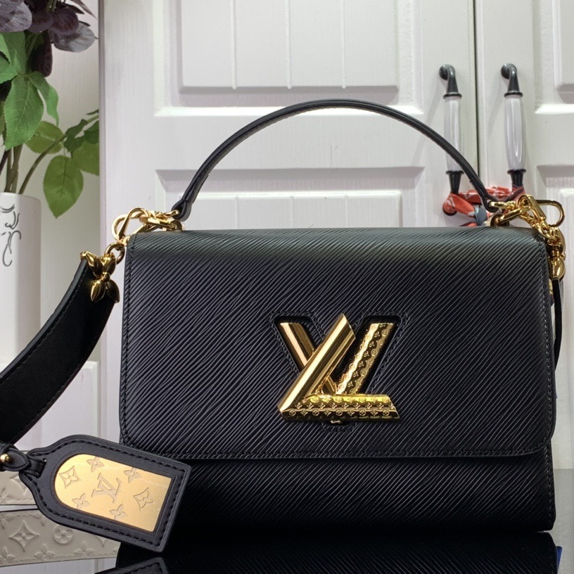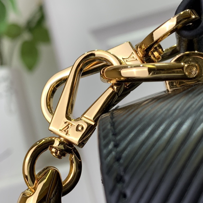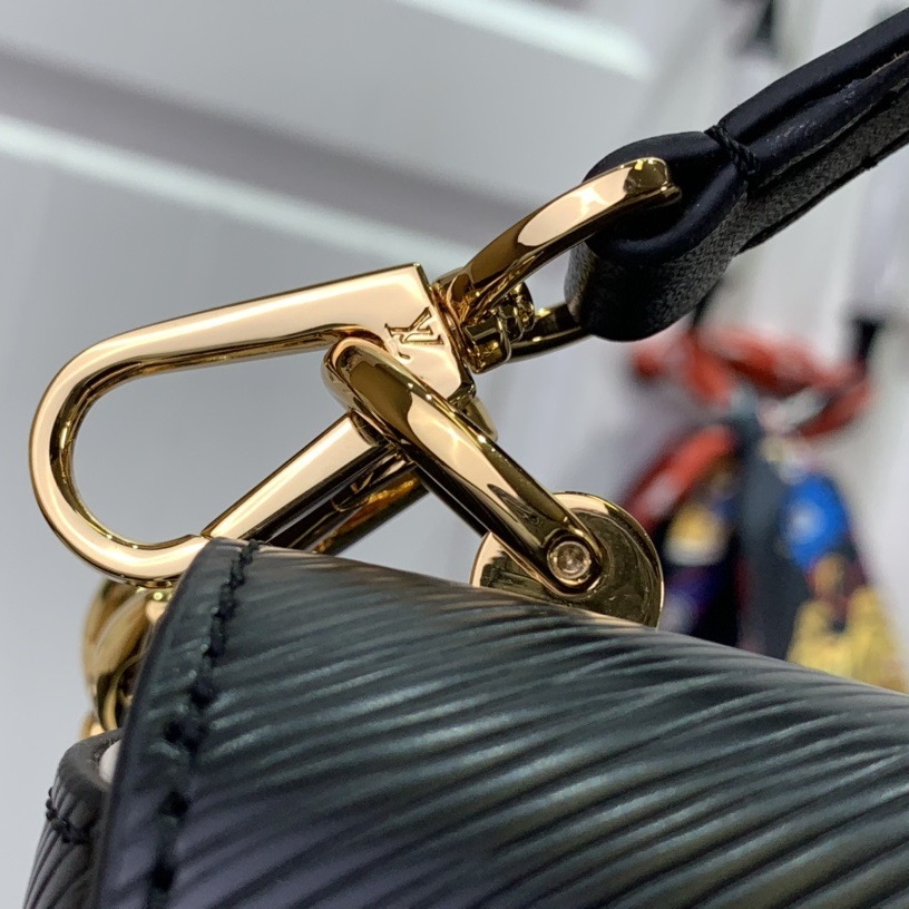 This Twist MM handbag is crafted from Epi leather. with its distinctive ridged embossing. It features a strap with a removable mirror charm. engraved with the Monogram pattern. and precious Monogram Flower hooks to attach it to the bag. The strap and the LV Twist lock are both adorned with the Monogram pattern.